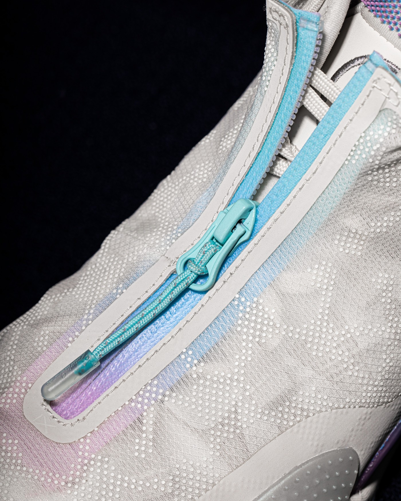 棉花糖的标志性渐变设计,点缀在中底承托盘和鞋面拉链部分。
