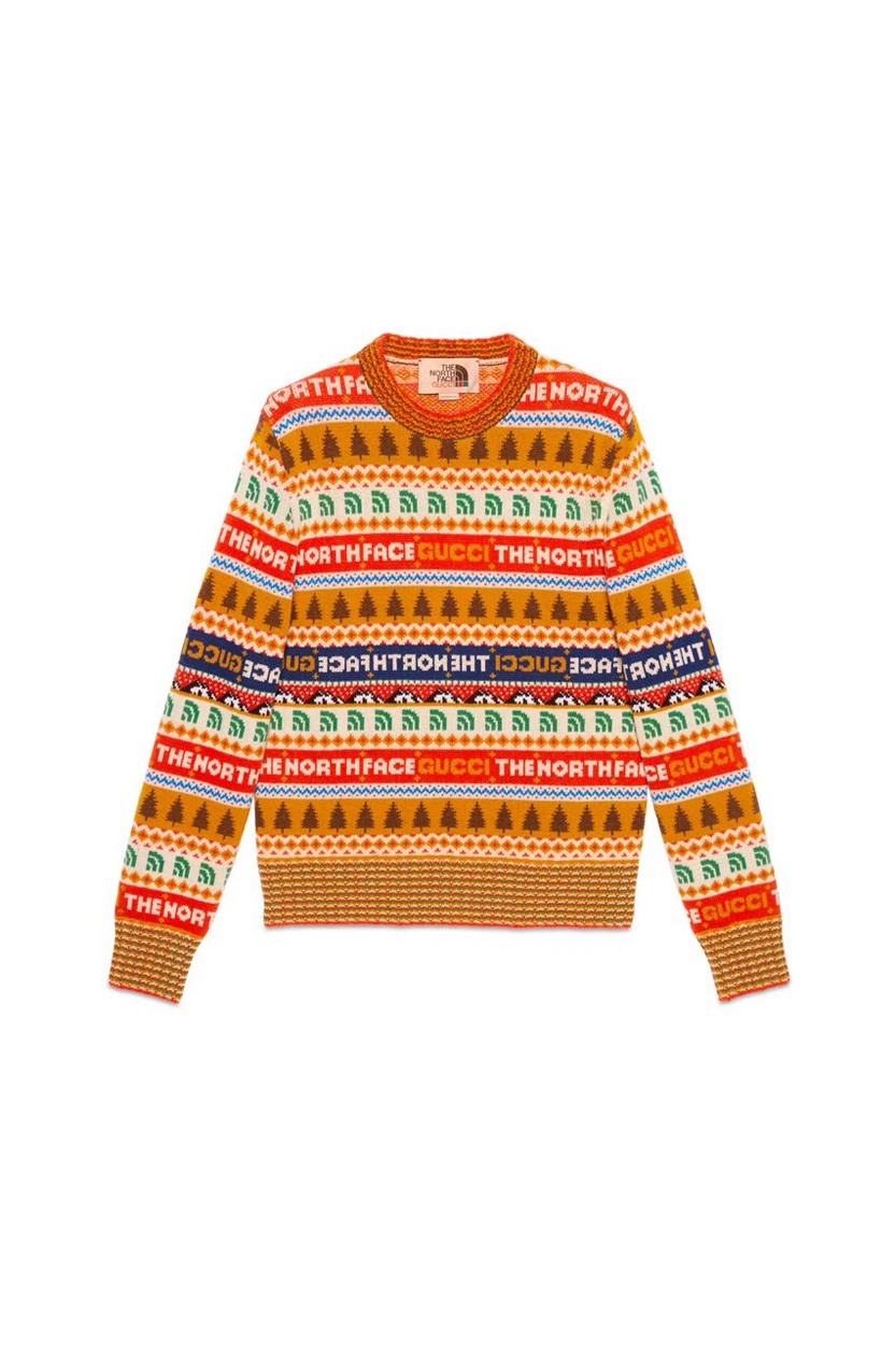 适合冬季穿搭的毛衣以花朵图案装饰,特点十足,印有 The North Face 字样的背包、户外长裤,彰显联名身份。