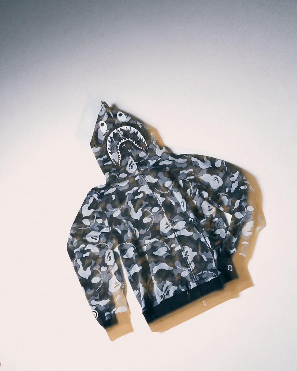 最重磅的 BAPE 鲨鱼帽衫,在保留传统外观的同时,在表面加入 COMME des GARÇONS 字体,辨识度很高。