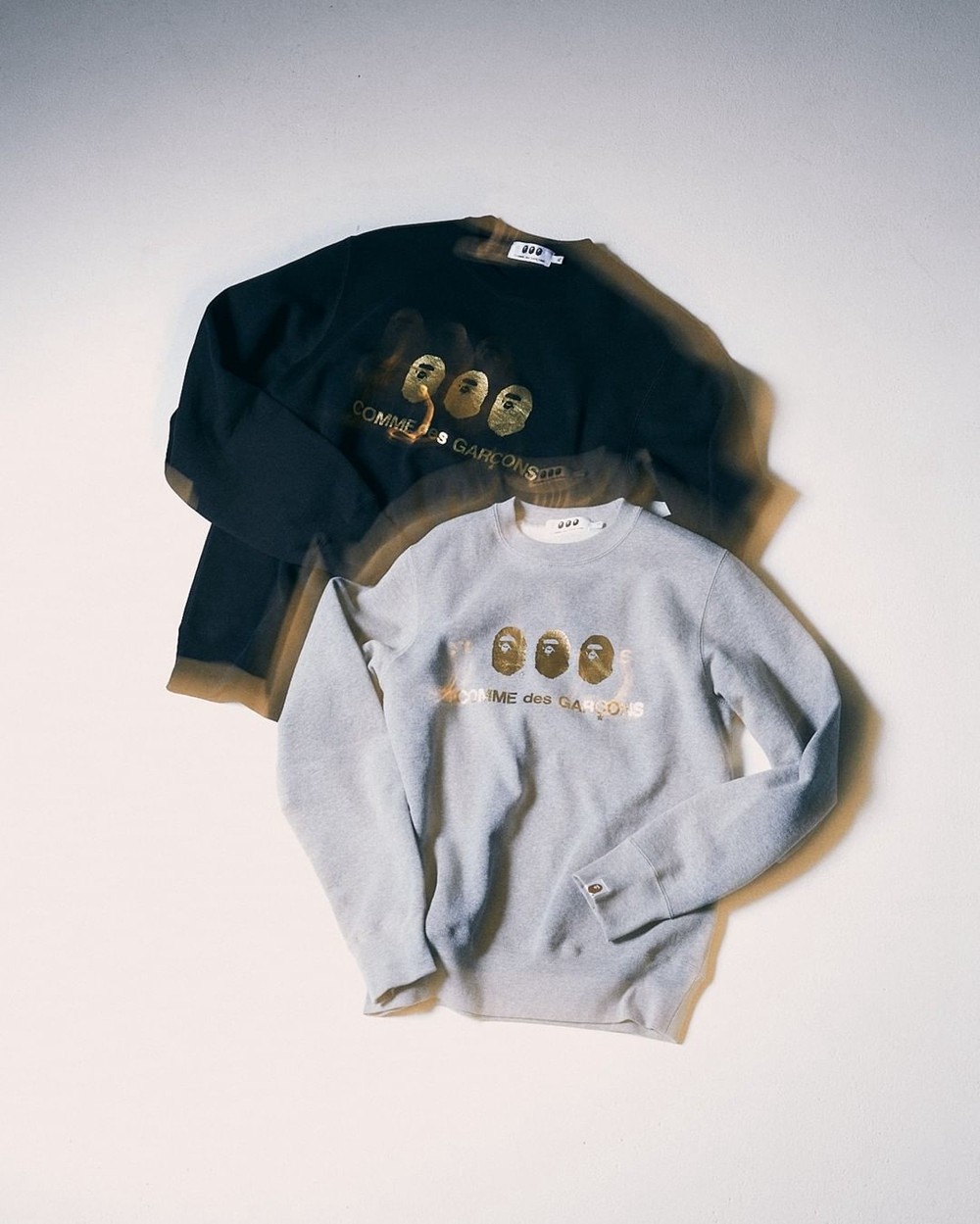 长袖卫衣将三个猿人 Logo 以并排形式展现,下方印有 COMME des GARÇONS 字样,彰显联名身份。