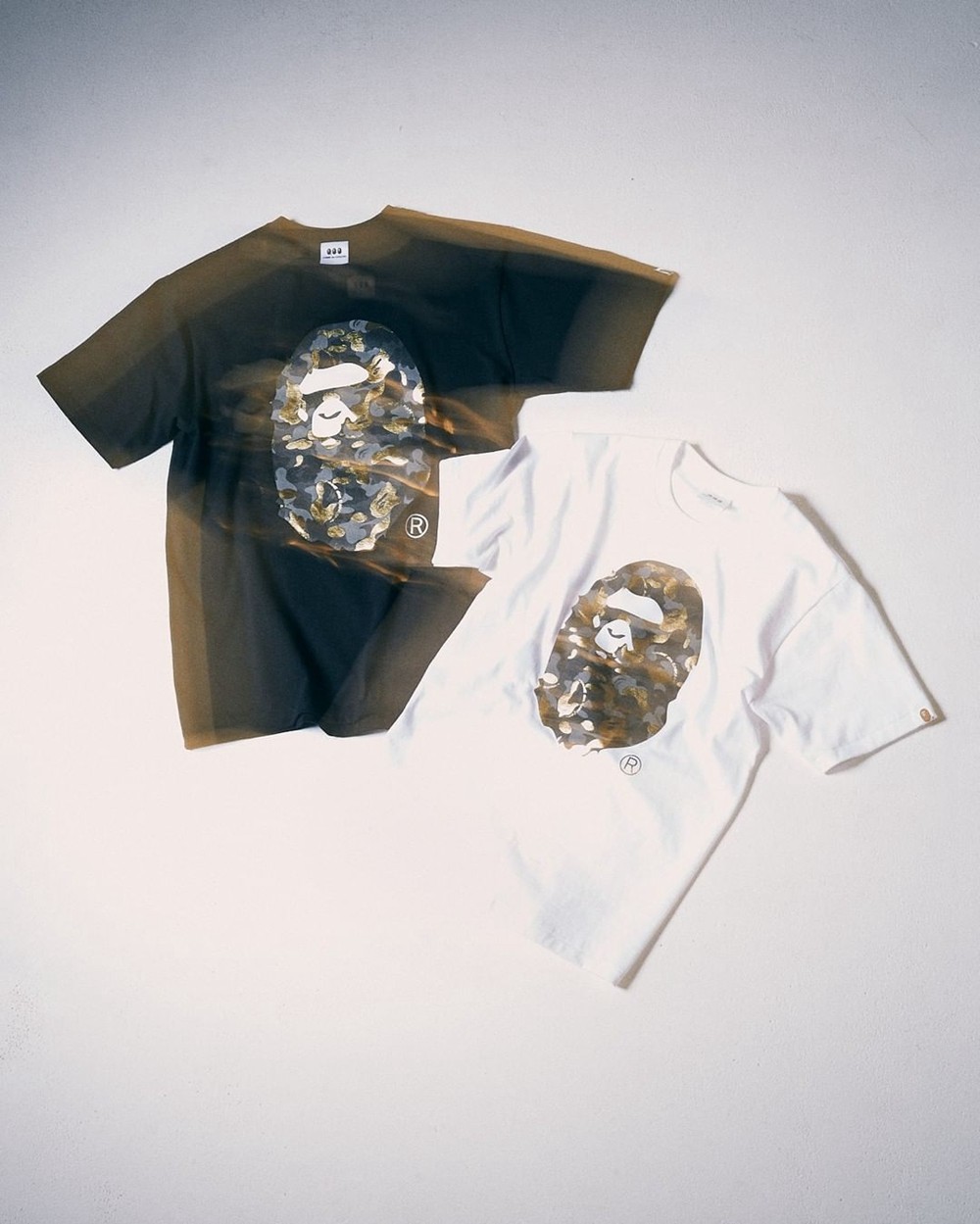 短 TEE 以经典 BAPE 猿人图案呈现,将经典的迷彩加入亮面金色点缀,共有黑、白两款配色。