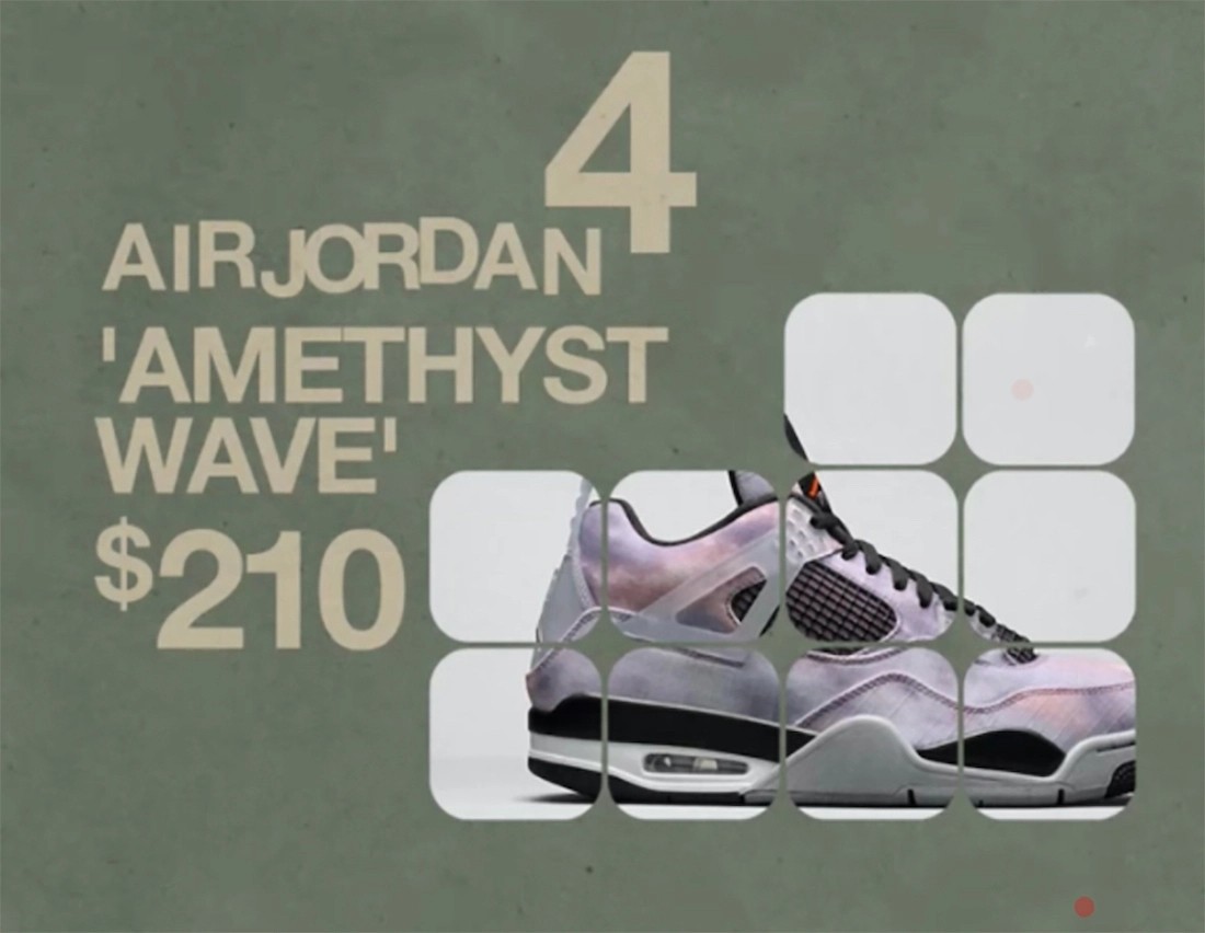 可以看出实物与效果图区别不大,整个鞋面采用类似于扎染的手法呈现,融入了红、黑、灰和紫多种颜色,再辅以水晶波浪纹理,呈现出类似星空的视觉效果,也因此被网友称为星空 Air Jordan 4。
