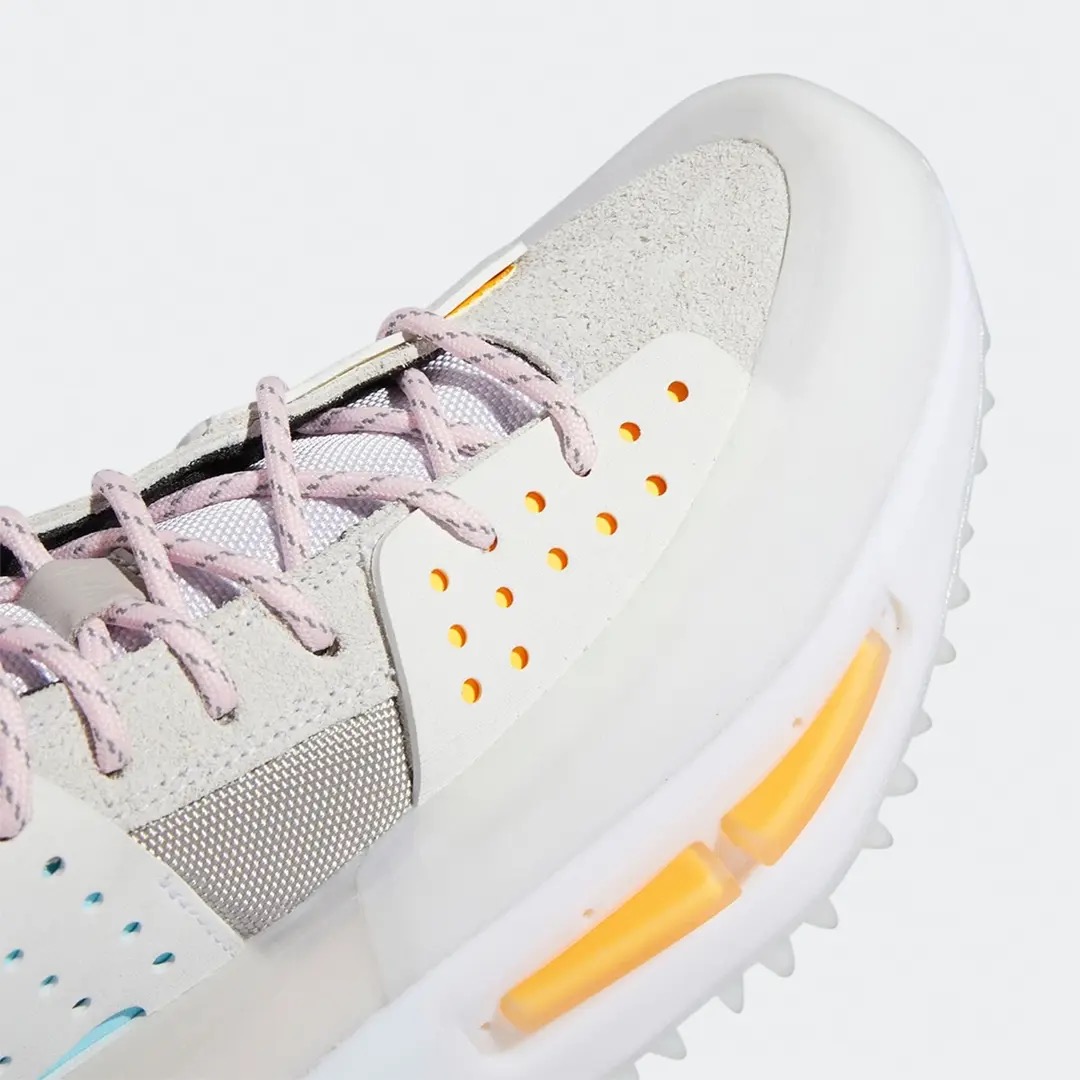 整双鞋以麂皮和网面材质打造,鞋身环绕白色橡胶条,搭配鞋侧彩色鞋带孔,层次感相当丰富。