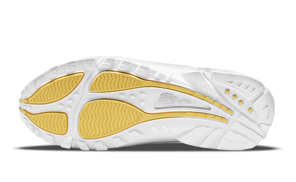 侧身处液态银效果的配饰,再加上气垫和外底上亮眼的黄色,都提升了这双鞋的辨识度。