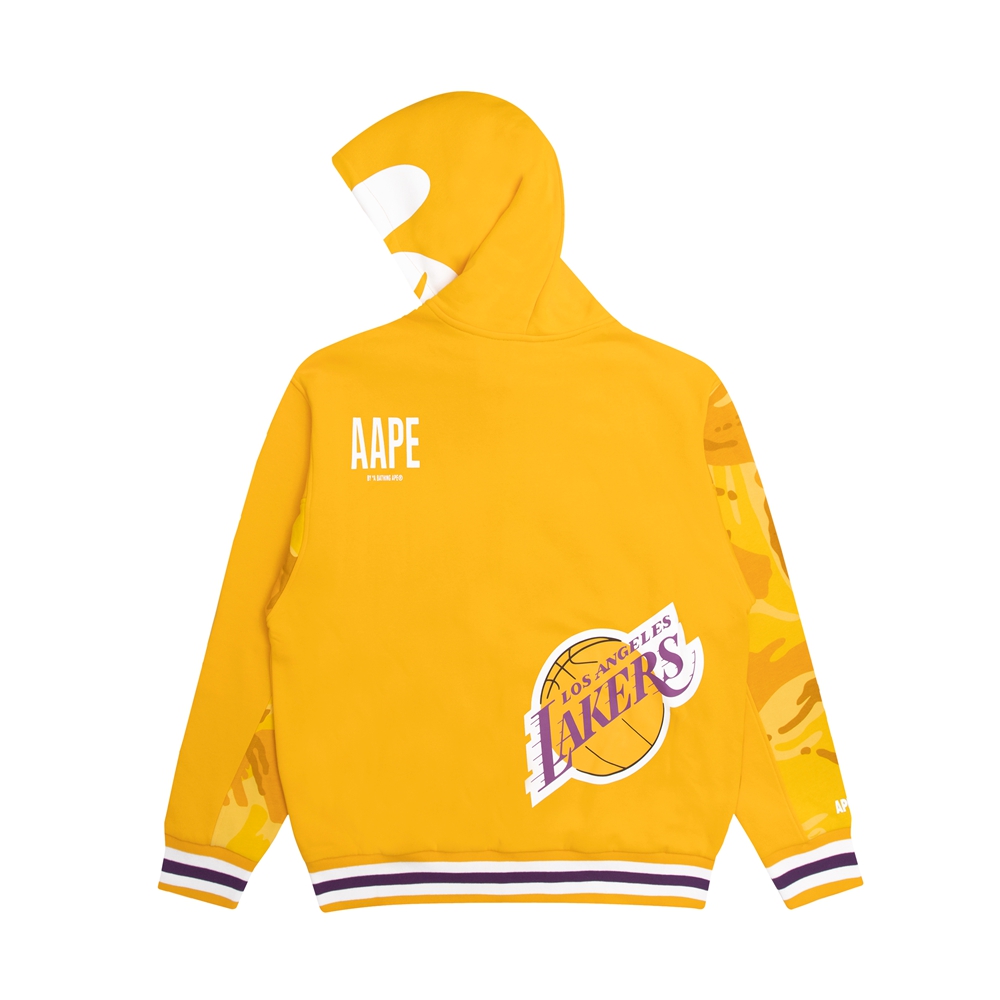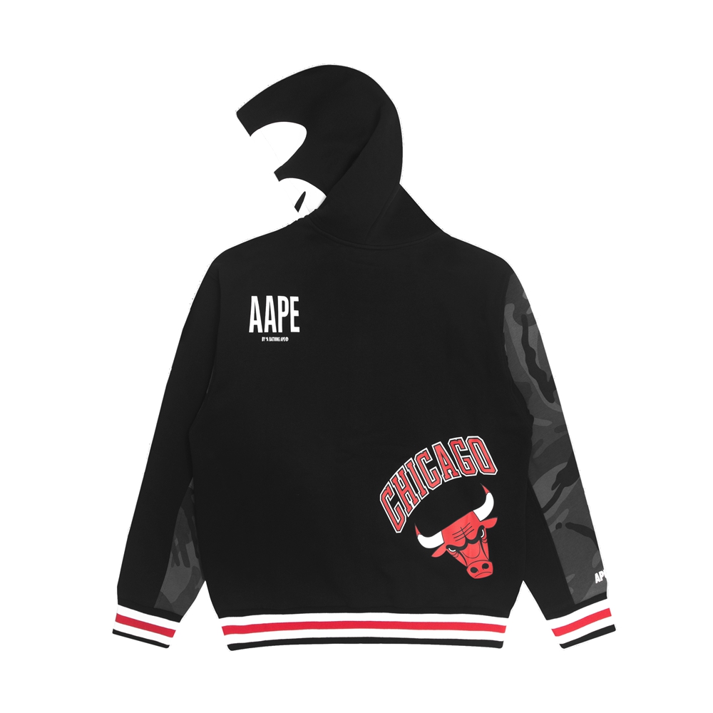 帽衫同样将 NBA 球队元素在多处呈现,搭配 AAPE 胶章与标志性的猿脸 LOGO,美式篮球文化氛围拉满。