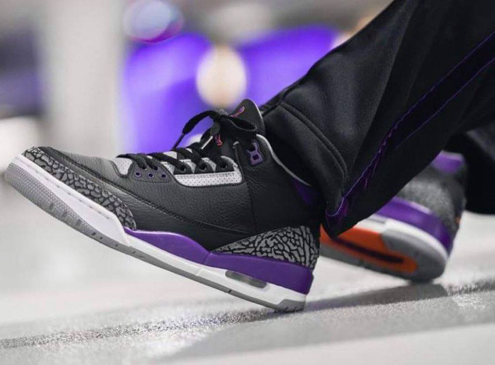 鞋带孔、鞋舌 Jumpman Logo 以及后跟等细节都是紫色呈现,黑紫撞色更被不少网友称为湖人 Air Jordan 3。