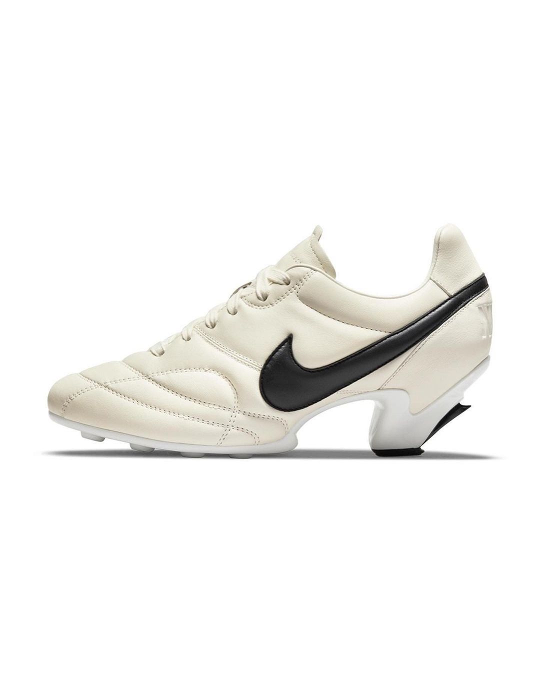 整双鞋看起来非常像 Nike 的复古足球鞋,鞋身侧面的 Swoosh 极为抢眼,高跟鞋却搭配蜡面的扁鞋带,视觉上真的太怪异了。