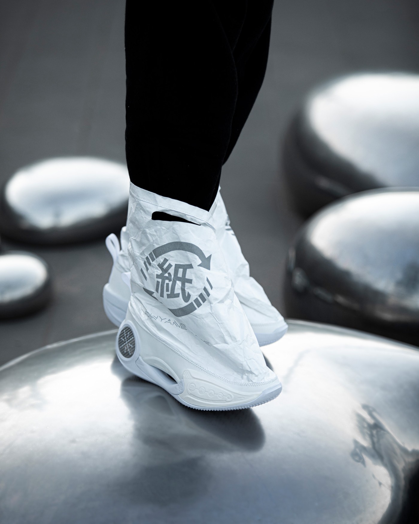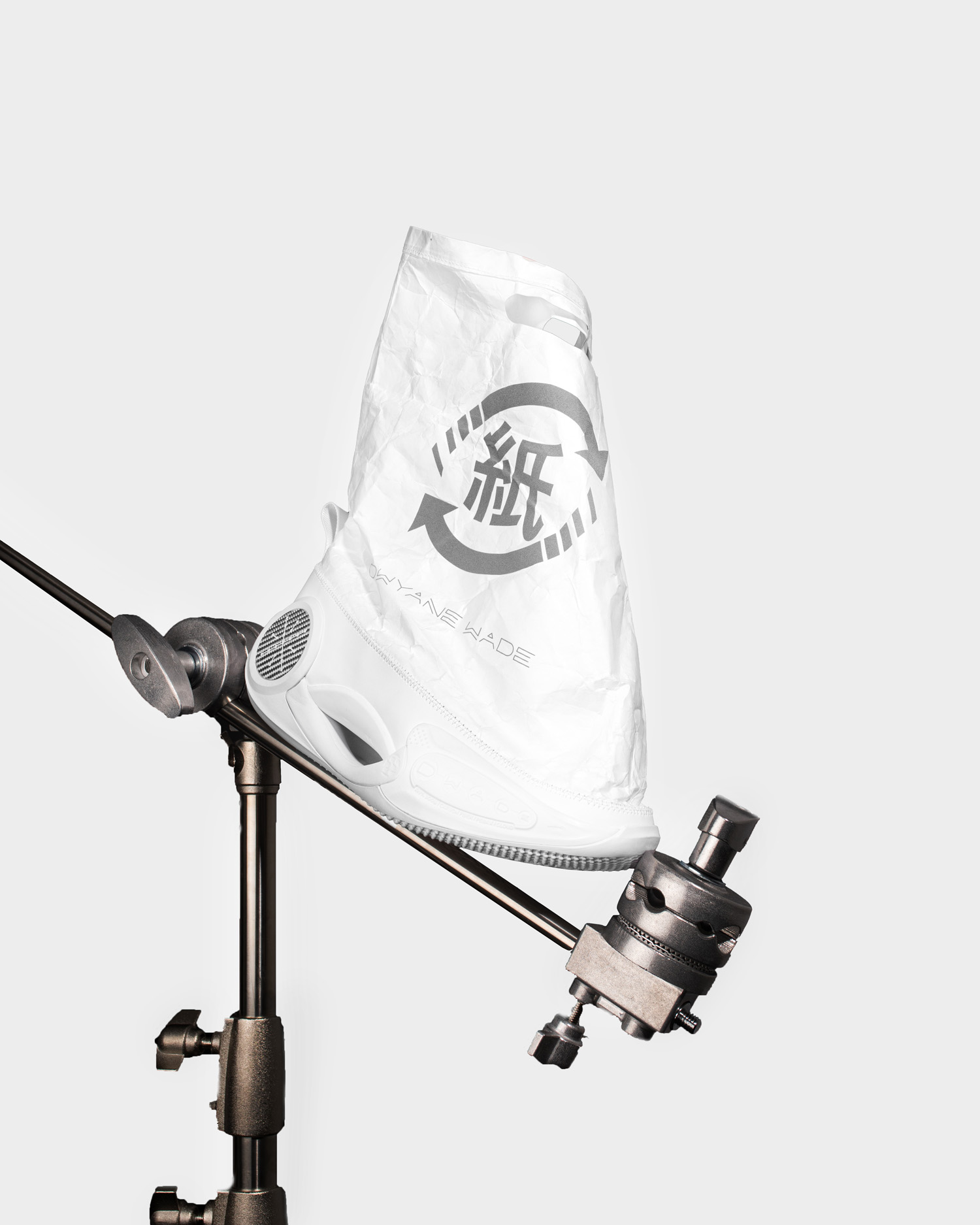 摘掉背带简单折叠后,纸袋包身就能作为外层鞋面,变成一款造型非常科幻的高筒球鞋。