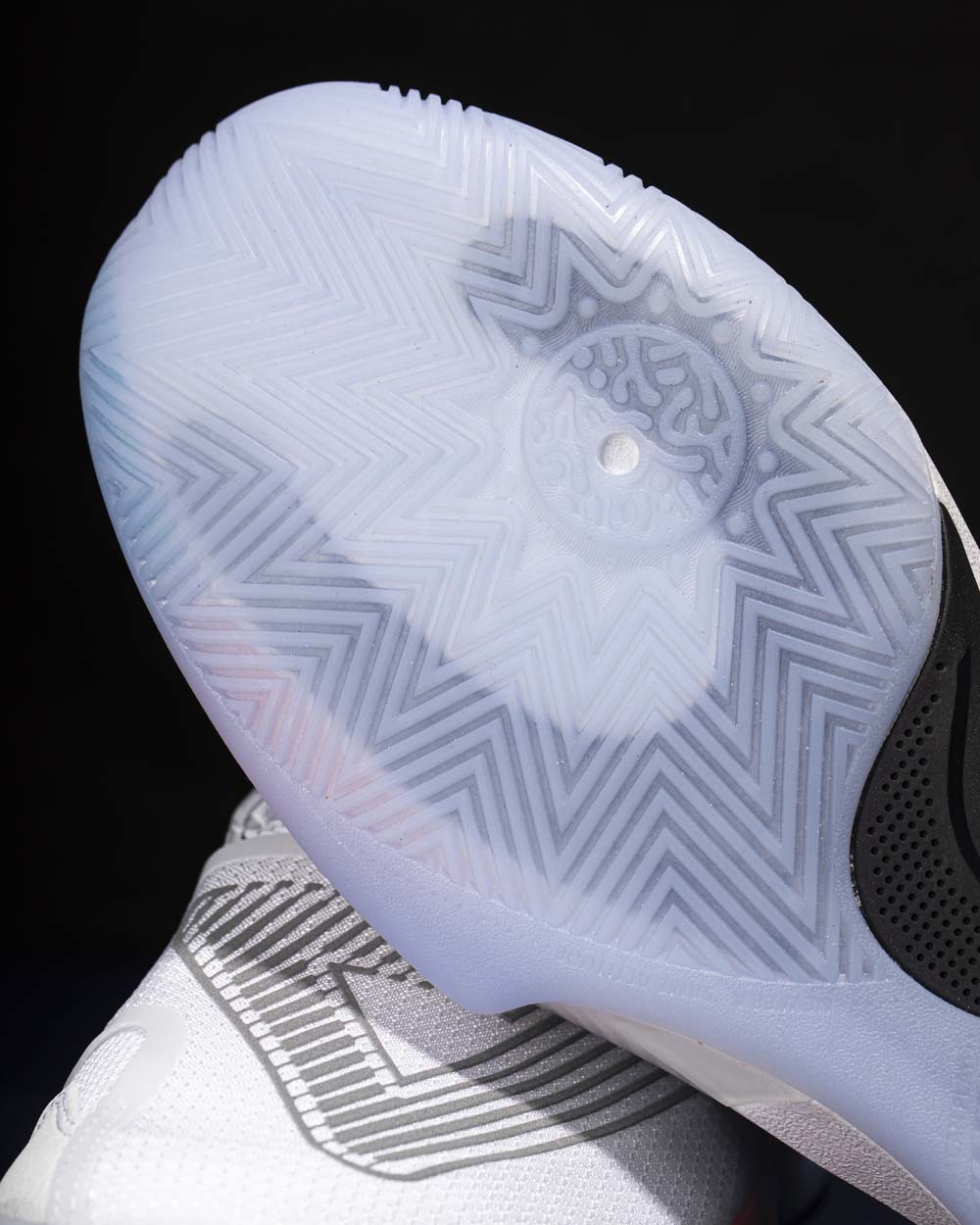 外底方面采用水晶底并内嵌了一块尼龙板稳定,搭配外露的大面积侧向支撑 TPU,提供更好的响应速度,保证球鞋的支撑性。