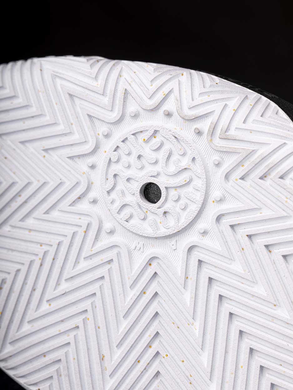 另一双 “黑曜石” 配色,以黑色为主色调,鞋面三角格纹大三角 Logo 与侧面金色暗纹饰片,呈现出低调中不失霸气的格调。