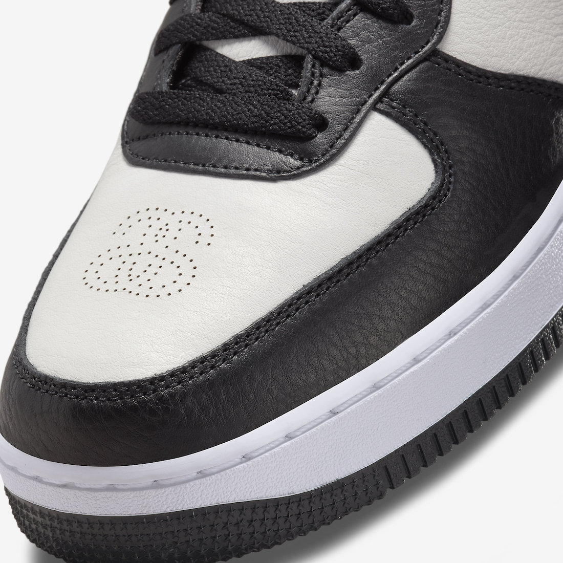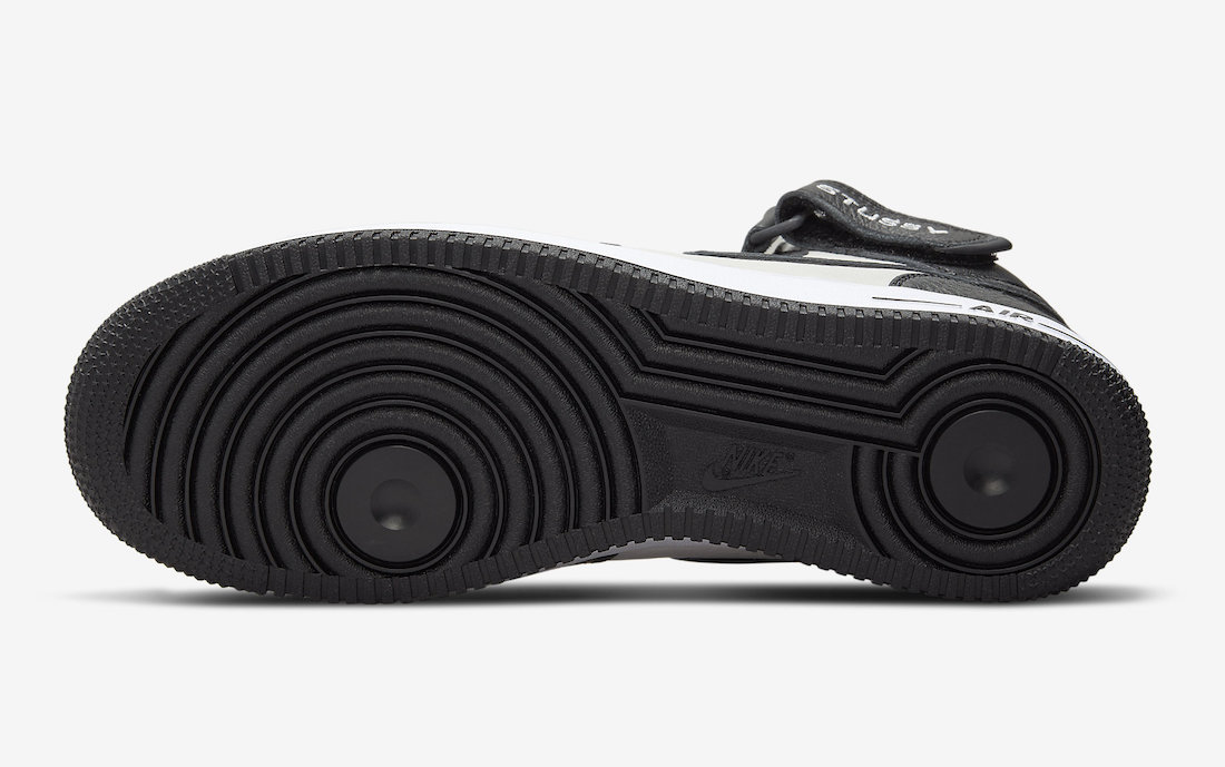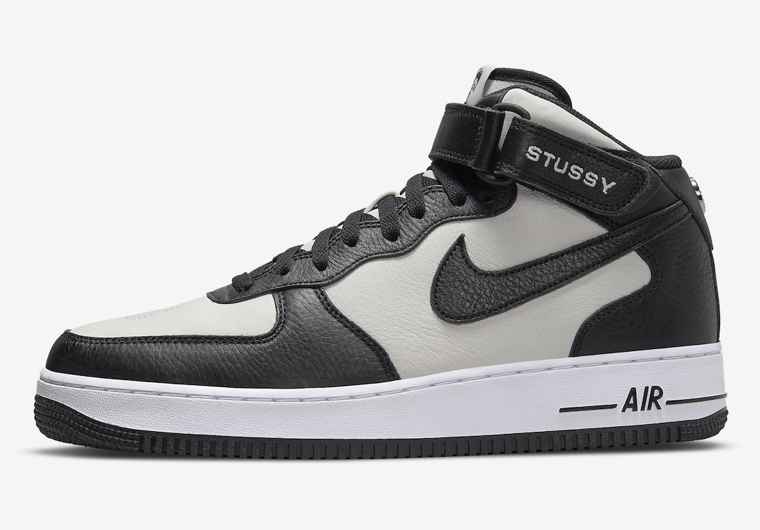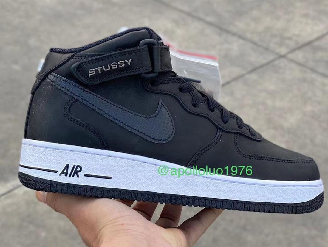 本月初一双全新 Stüssy x Nike Air Force 1 Mid 首次曝光,近日黑白配色的官图正式释出,同时还有一款纯黑鞋面配色曝光。