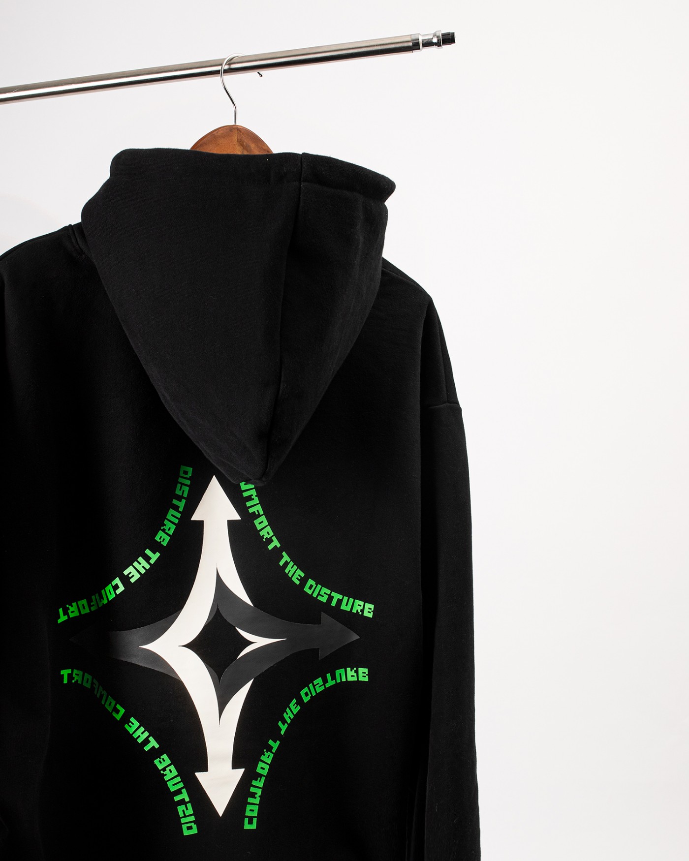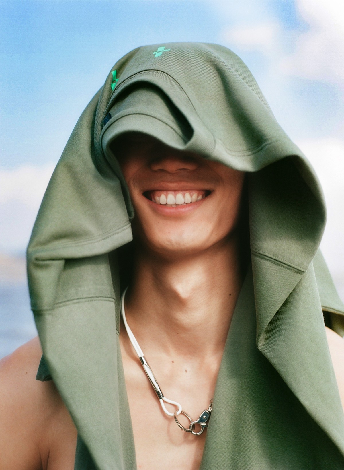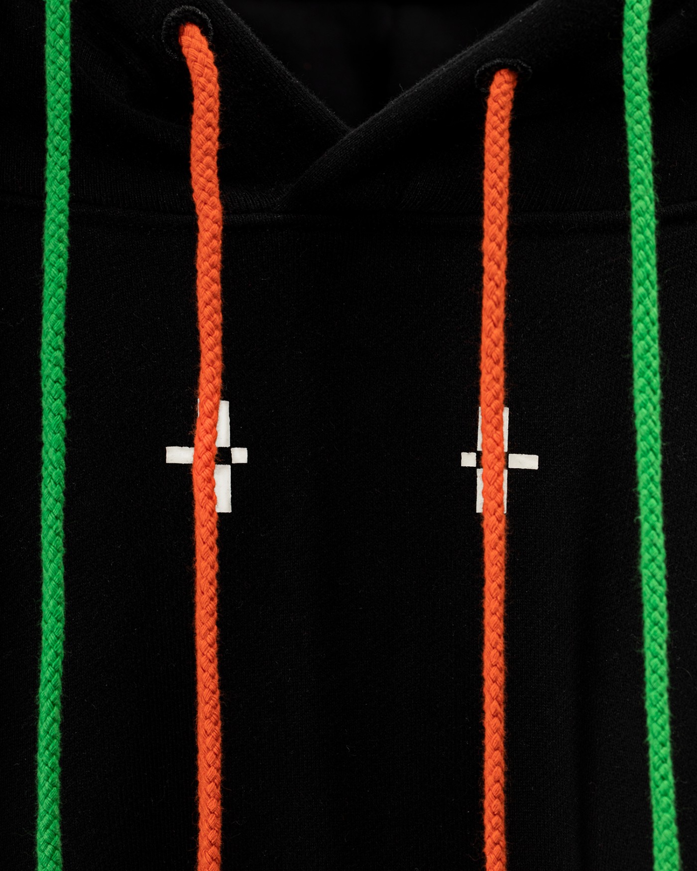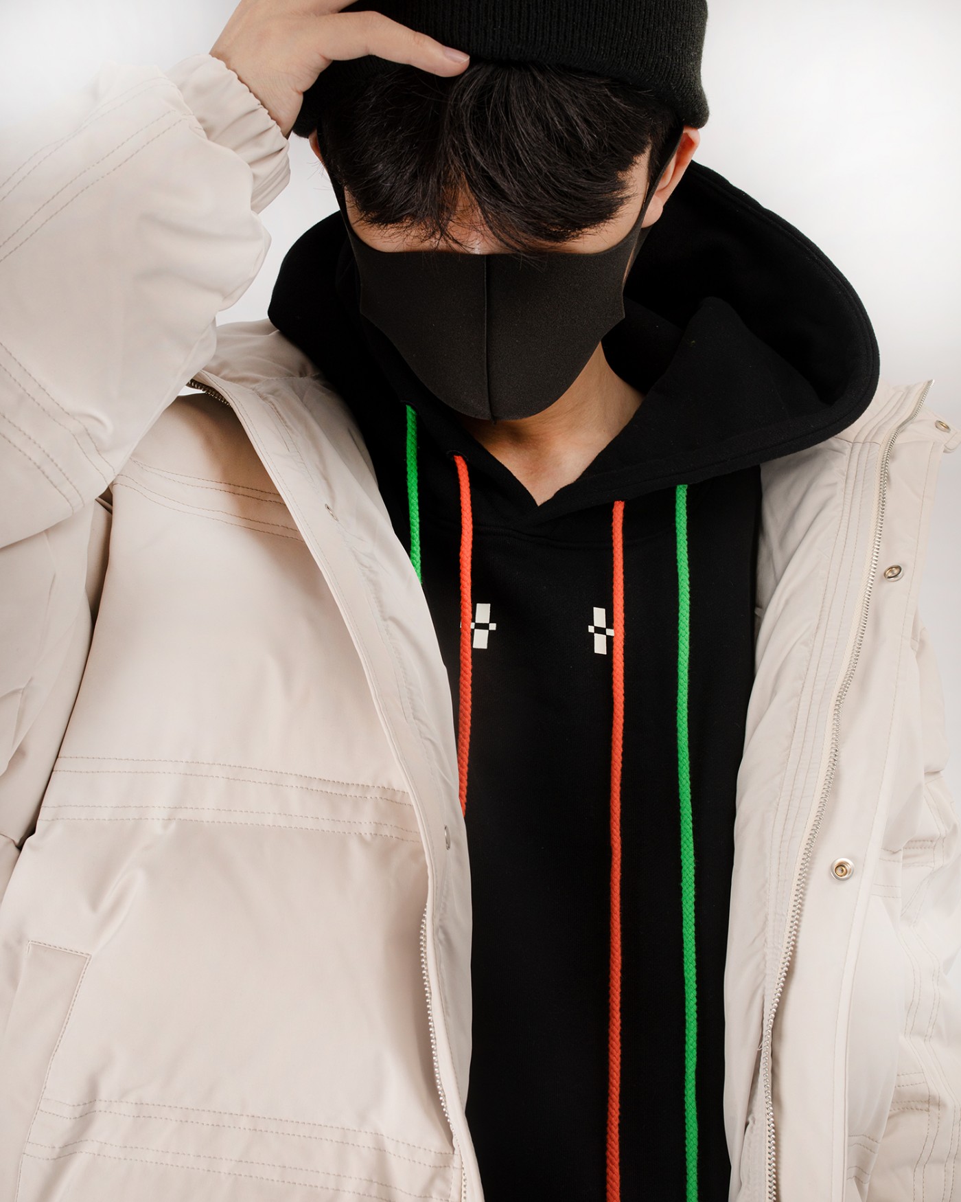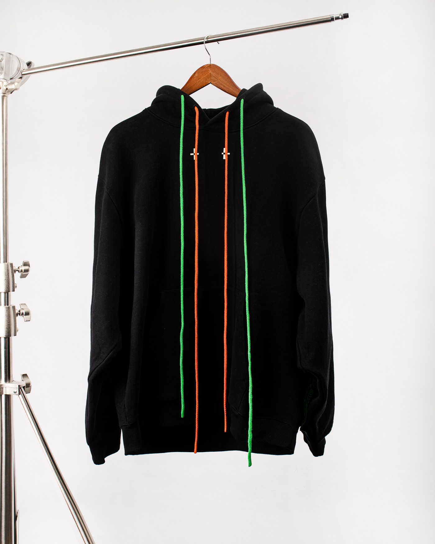 橙、绿双色系绳特别进行了加长设计,在黑色卫衣的衬托下,不需要太多复杂的元素就能营造吸睛的个性玩味效果。