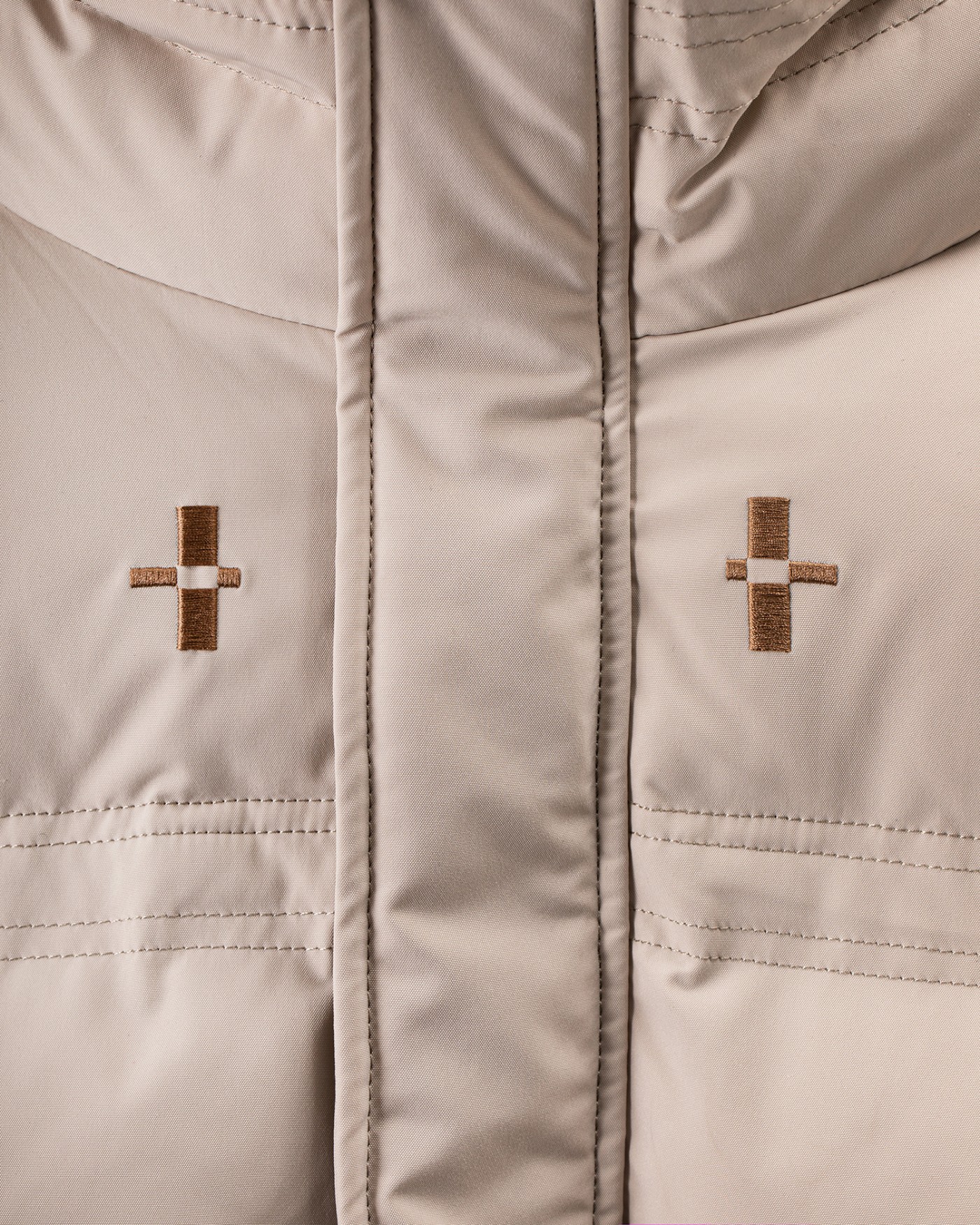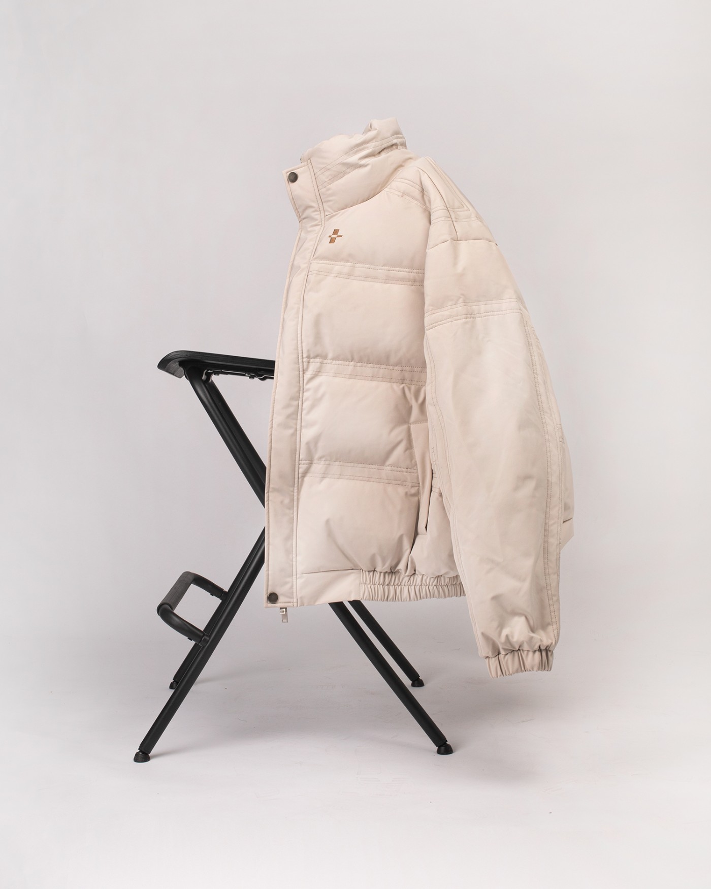 另一件米白色羽绒服,通过聚酯纤维面料搭配内胆灰鸭绒共同打造,带来轻质且温暖穿着体验。