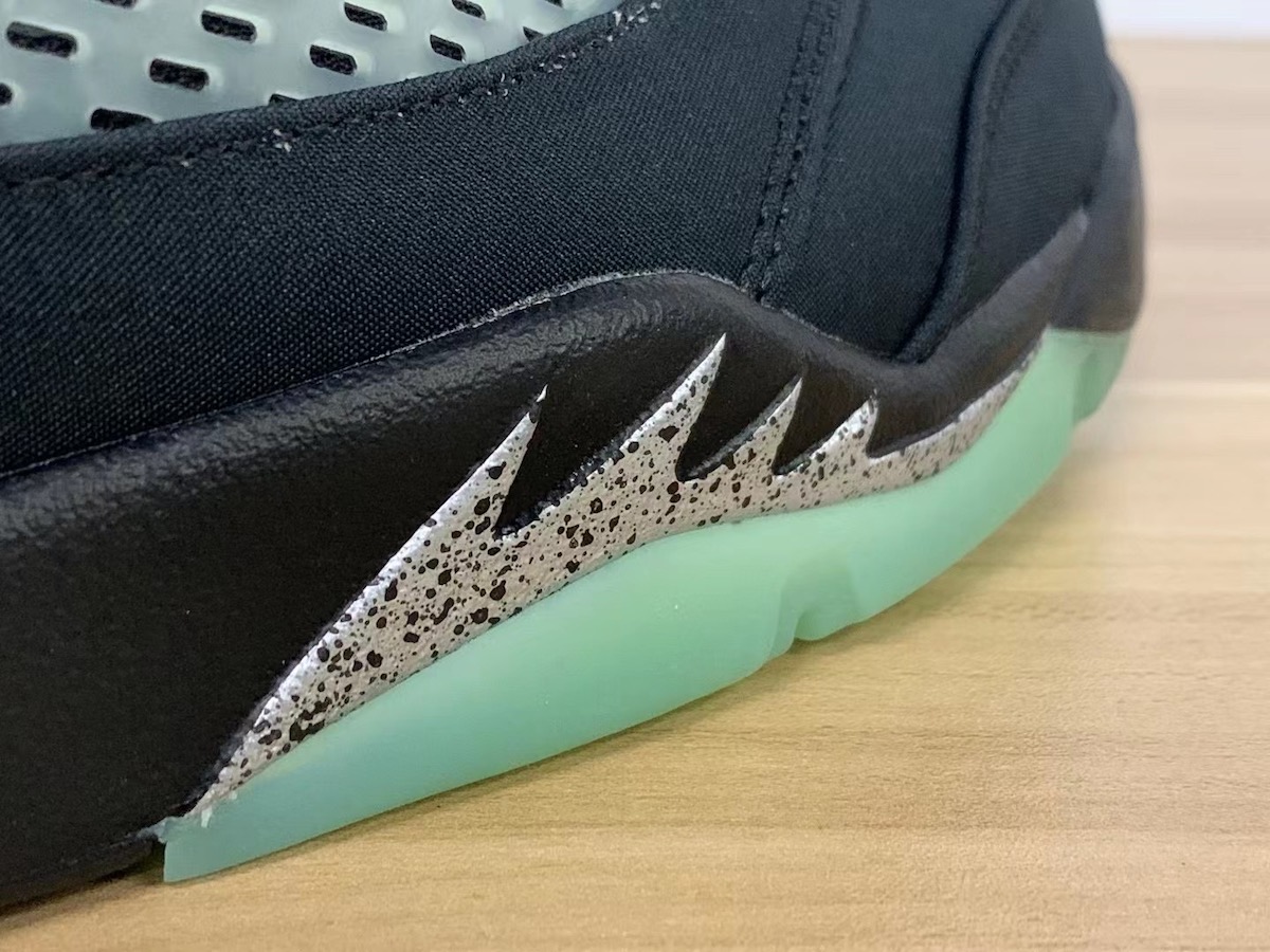 左、右脚后跟的 CLOT 与 Jumpman Logo 和前掌绿色水晶外底中隐约透出的 CLOT LOGO,都彰显出这双鞋的联名身份。