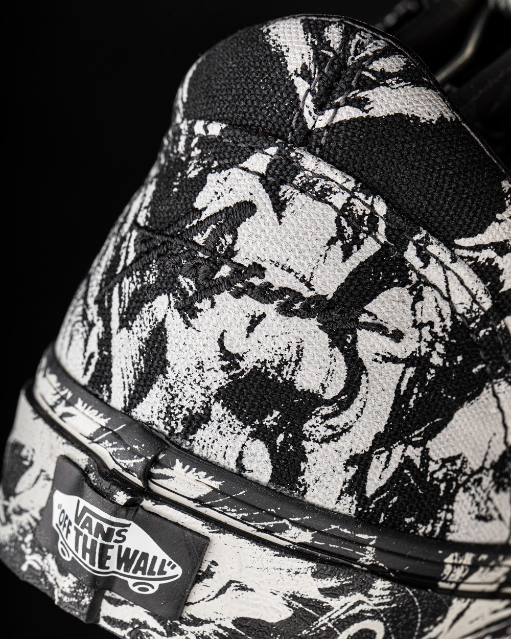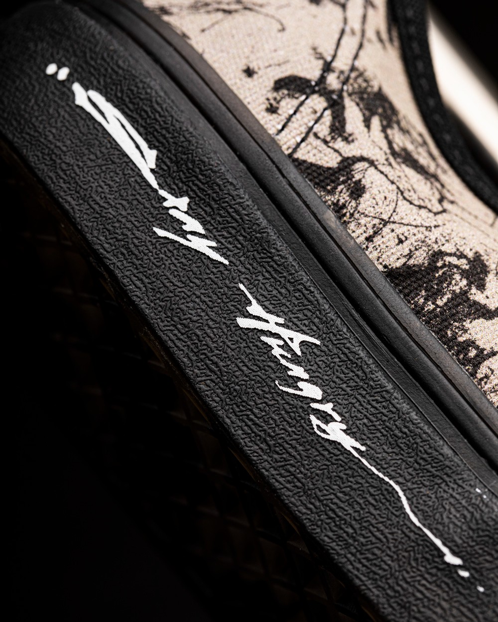鞋面采用帆布材质,灰黑水墨印花大面积铺满鞋面,制造出强烈的视觉反差。