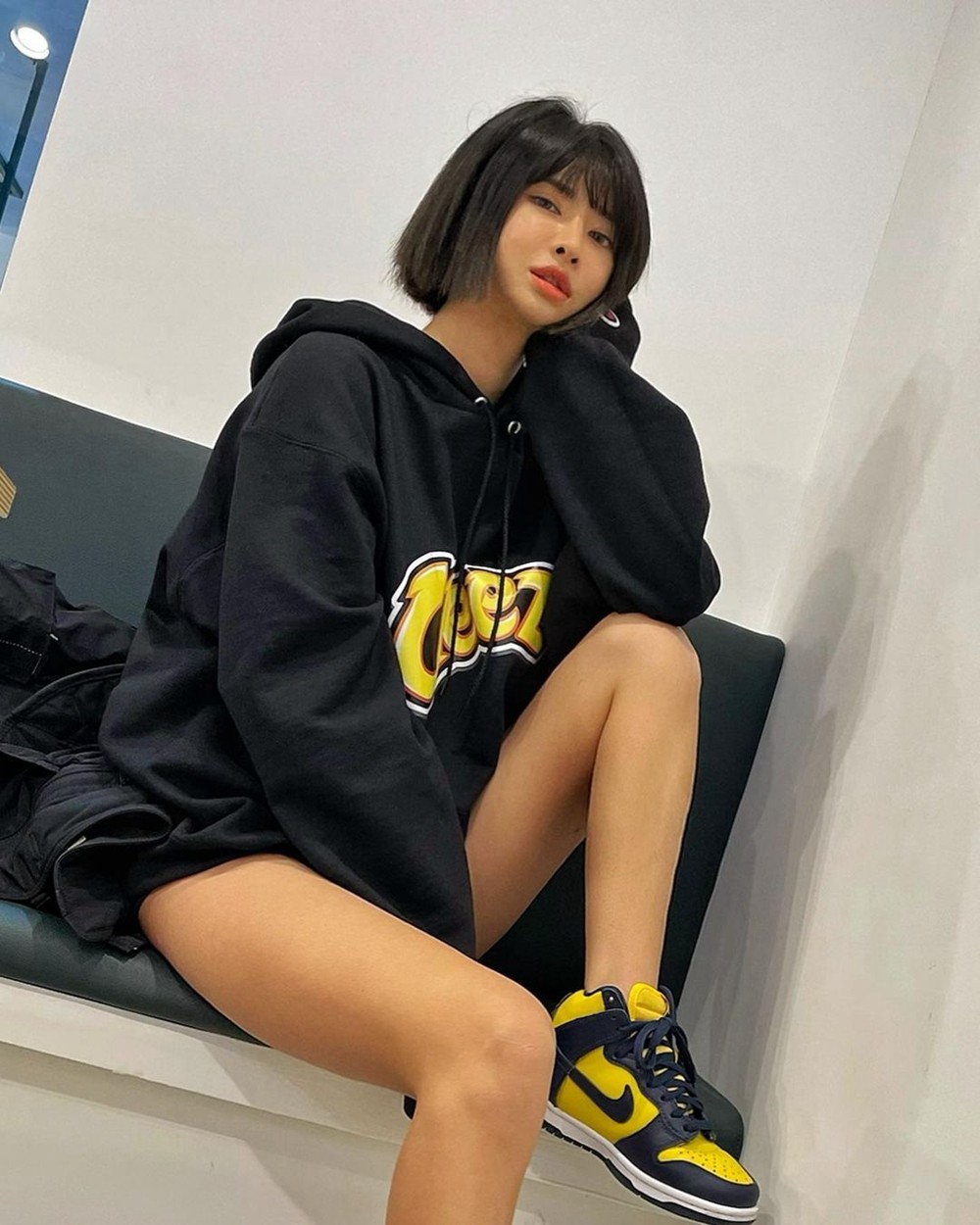 Yena 私下同样十分爱鞋,并且穿搭风格也值得学习,例如这一波黑丝配黑色 Yeezy 700 “黑武士”,试问哪个男生顶得住?