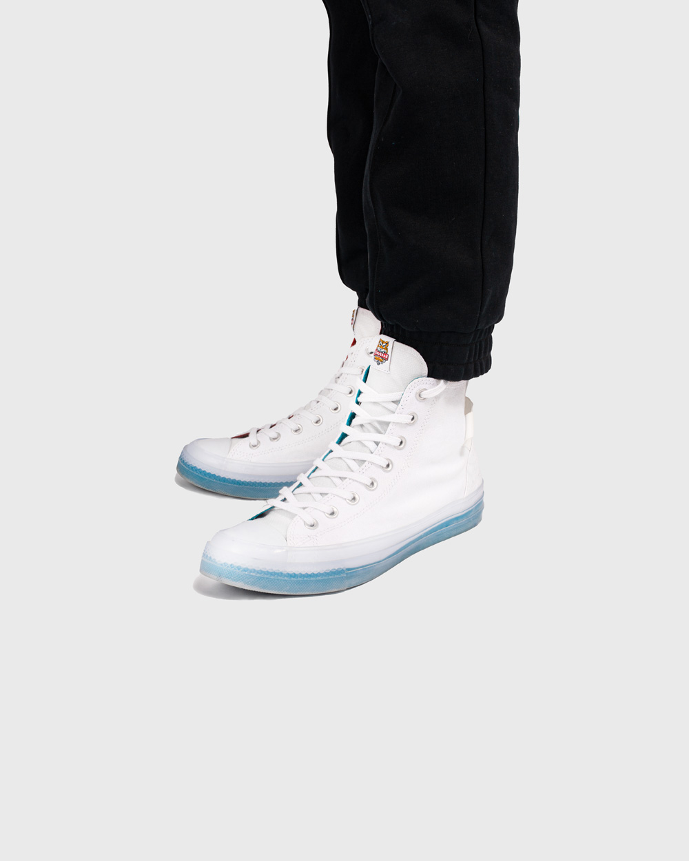 Chuck Taylor All Star CX 则以白色为主体,鞋底以透明橡胶包裹蓝色 CX 发泡材料。
