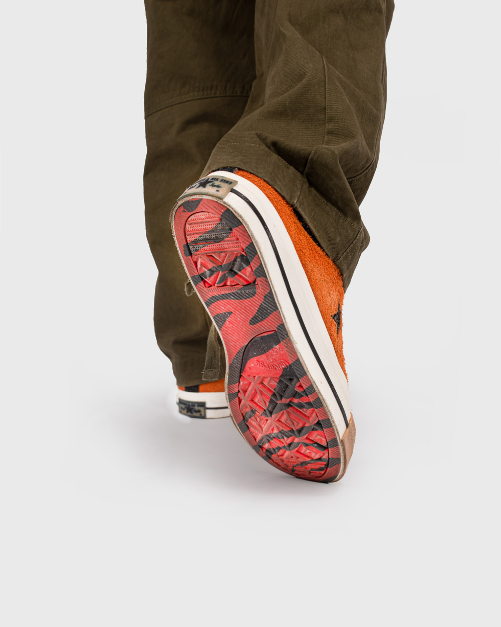 采用橙色翻毛皮和黑橙双色绒面革打造鞋面,真有一种虎虎生风的野性气质。