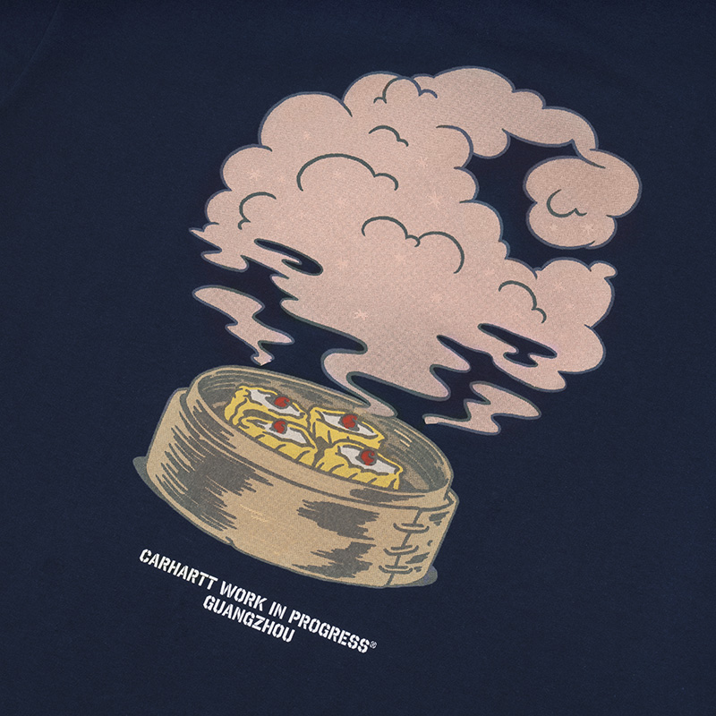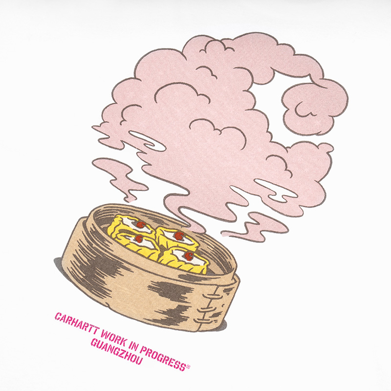 以广式蒸笼点心烧卖为灵感,从食物上冒出的粉色蒸气及杞子则是以「C」Logo 的形态呈现,融合趣味的插画风格展示广州本地文化、与街头时尚完美结合。