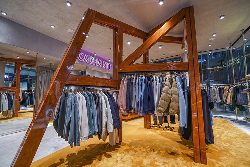店内利用不规则的胡桃木组架系统穿梭陈列空间,贯穿全店提供视觉空间的分隔,构筑极具工艺感的轮廓线条,呈现 Carhartt WIP 的实用美学。