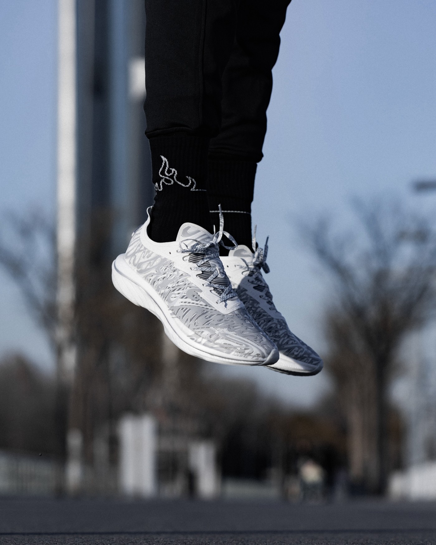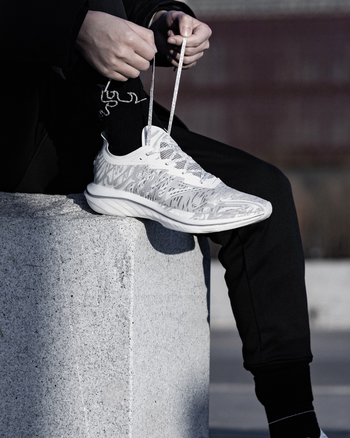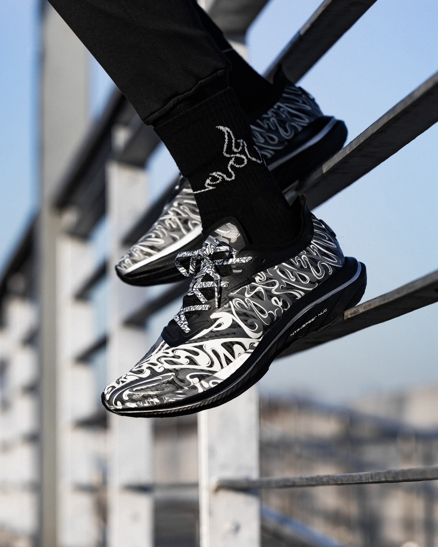 黑、白两款配色分别对应「拨云见日」和「拨云见月」,鞋身类似水墨云雾的写意刻画,既释放出浓郁的中国风气质,又彰显出日月沙盘流动特性。
