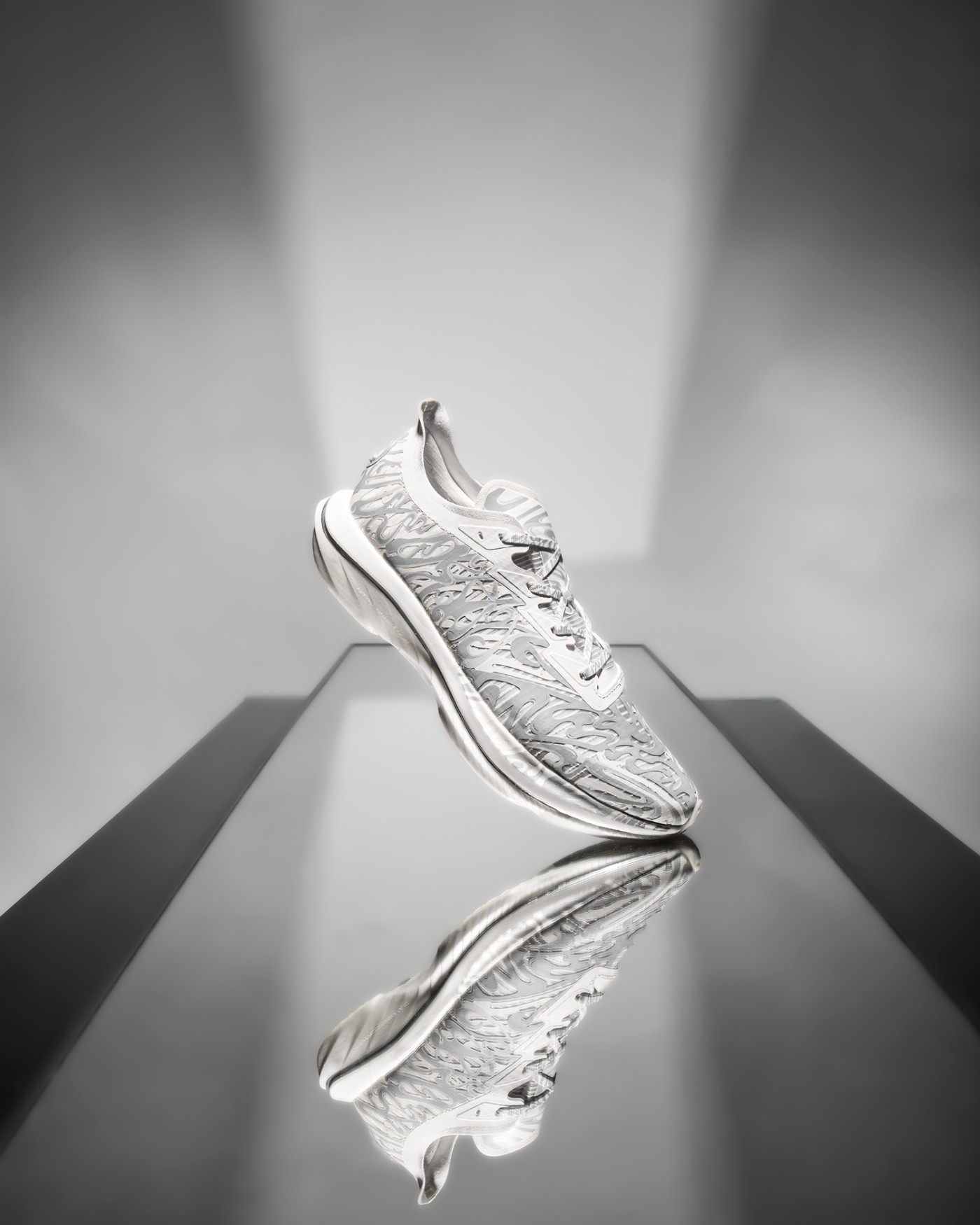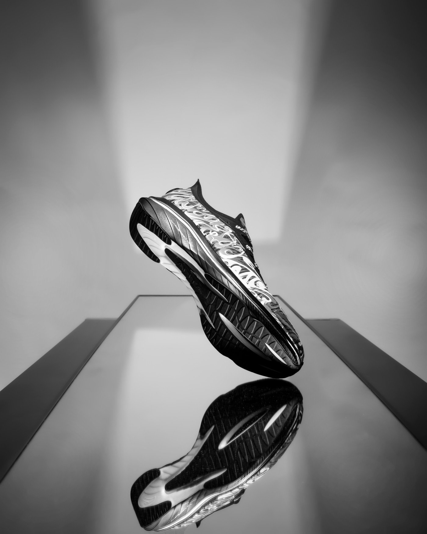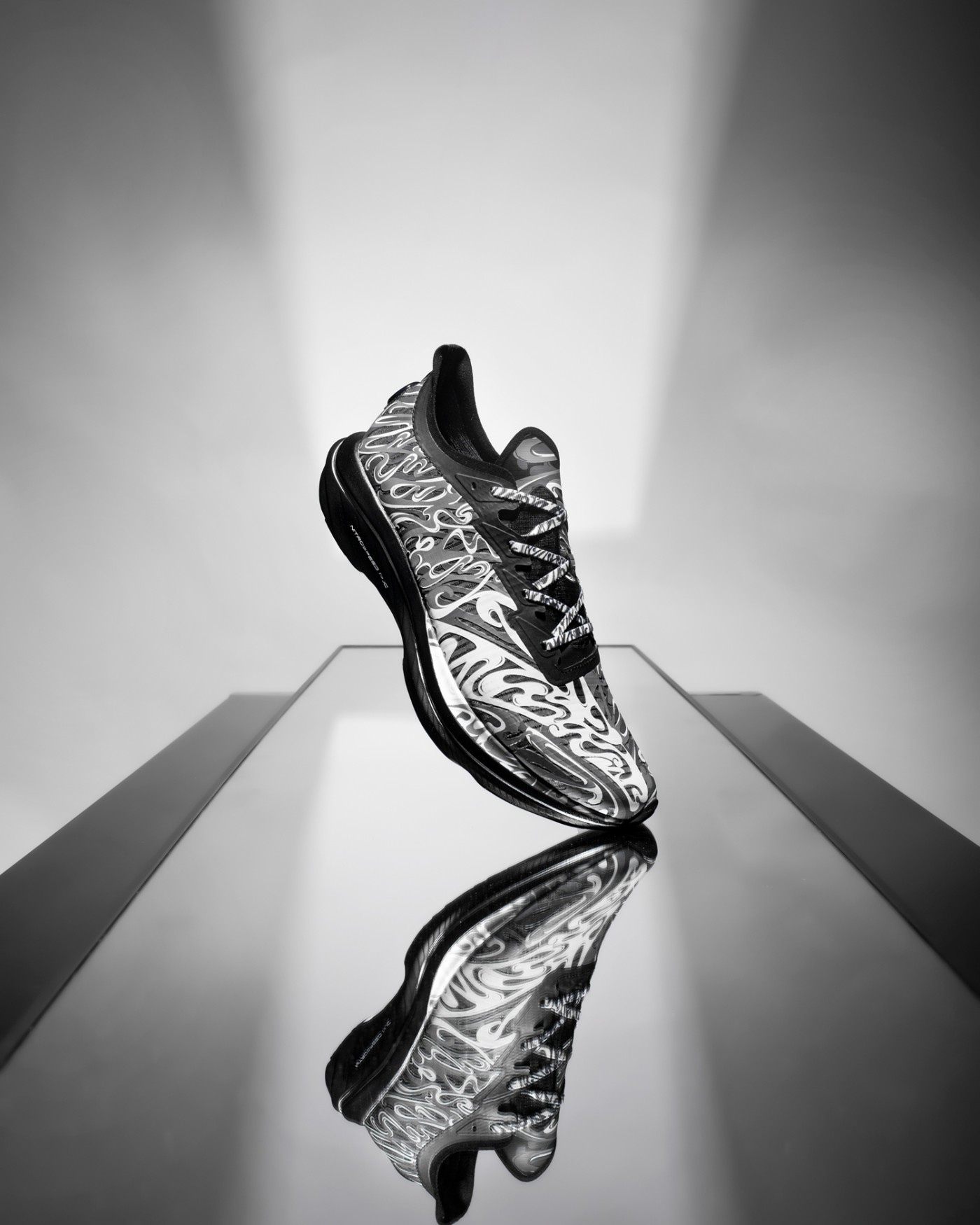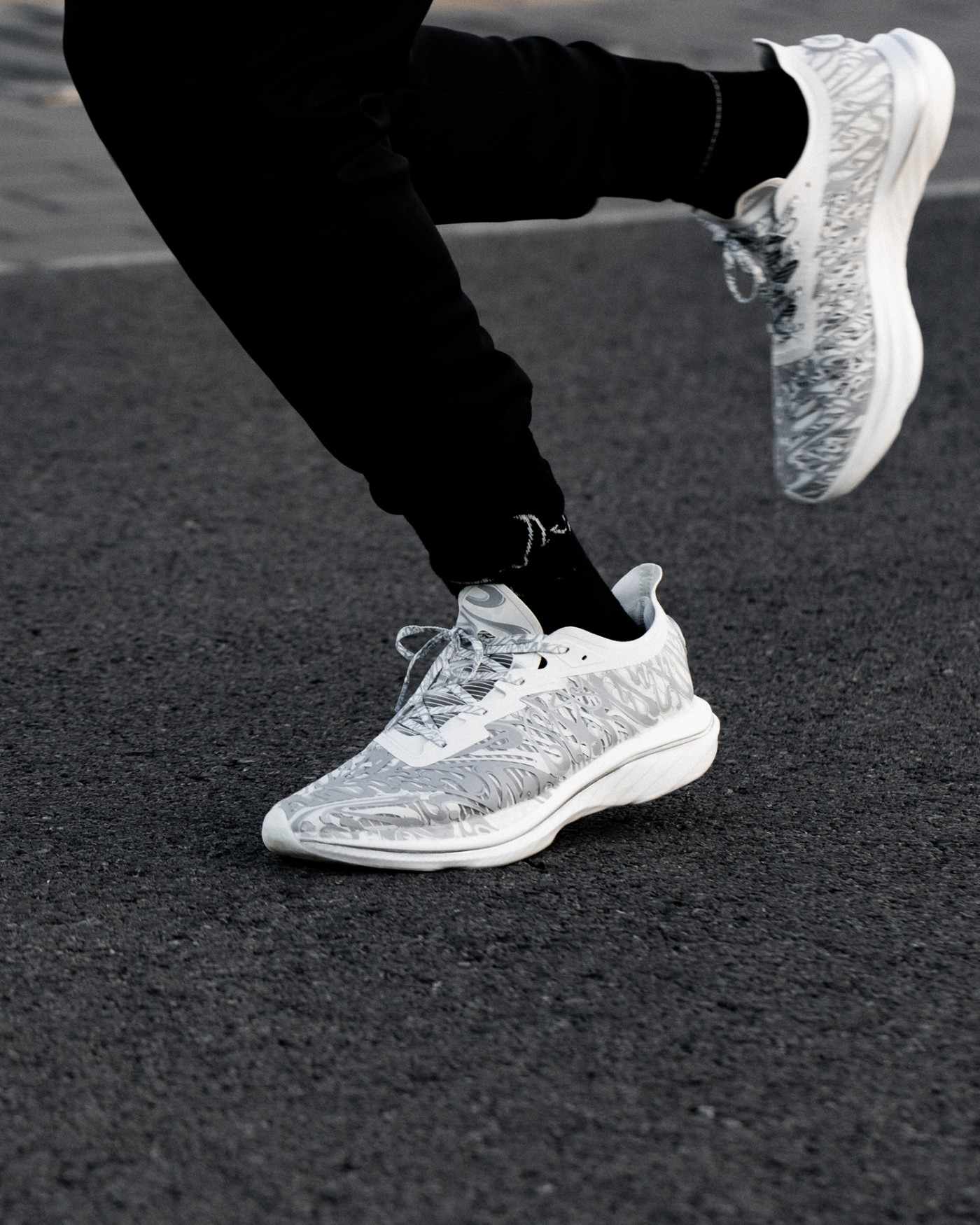 黑、白两款配色分别对应「拨云见日」和「拨云见月」,鞋身类似水墨云雾的写意刻画,既释放出浓郁的中国风气质,又彰显出日月沙盘流动特性。