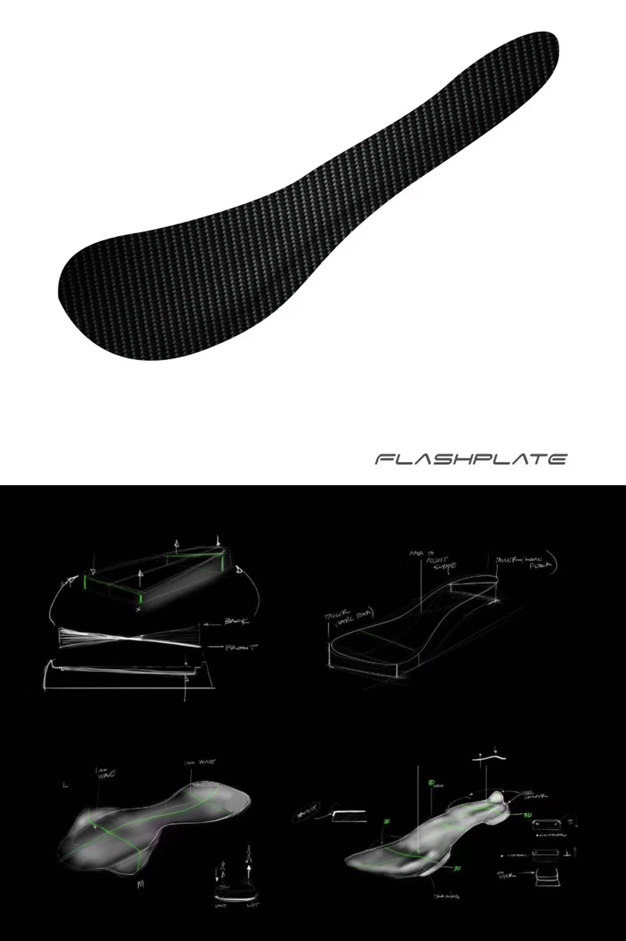 基于人体工学,安踏将全掌碳纤维板增加了横向仿足弓的曲面弧度。