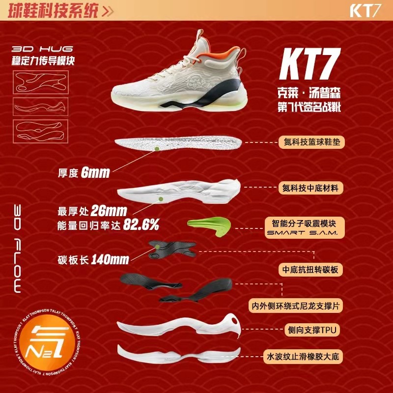 KT7 采用全掌安踏氮科技搭配 SMART S.A.M 智能分子吸震材料以及碳板。