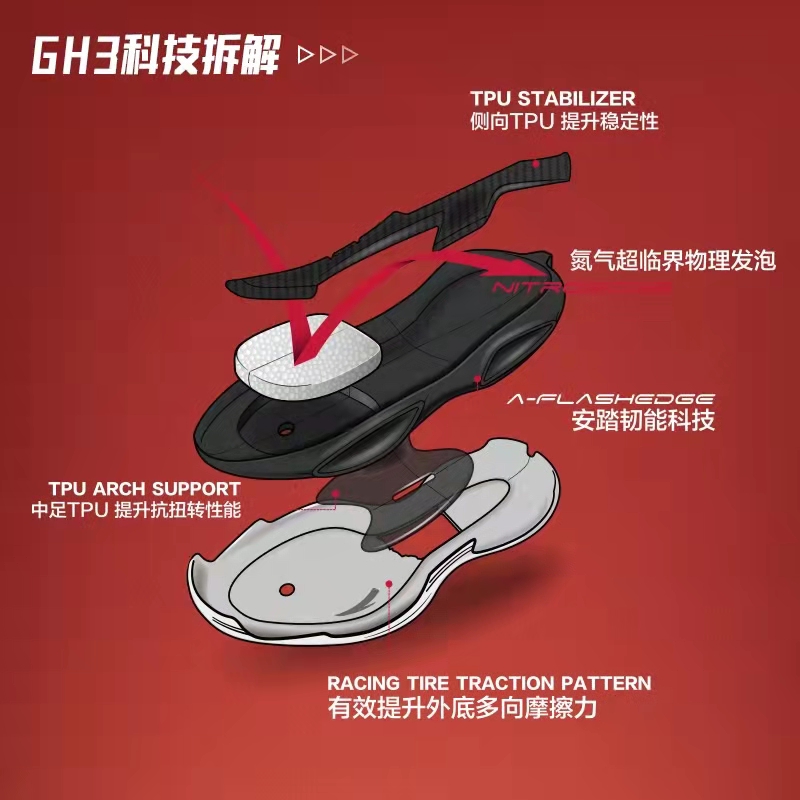 GH3 则以 A-FLASHEDGE 底盘搭配前掌安踏氮科技和大面积 TPU。