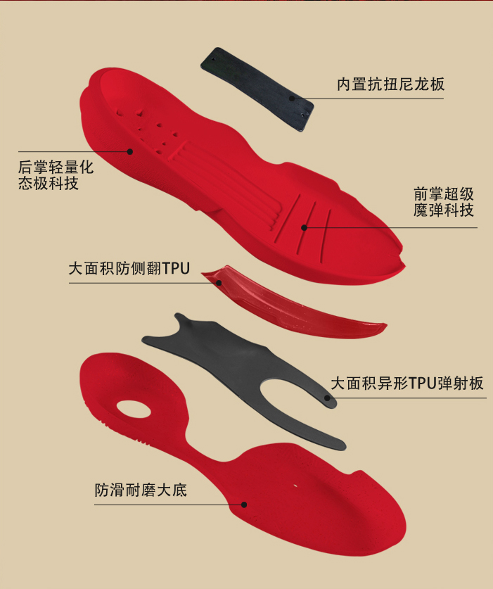 性能方面全新升级的匹克态极大三角搭载一模双密的全掌缓震配置,前掌超级魔弹科技,提供快速回弹响应,后掌轻量化态极科技,赋予更为均匀的落地缓震。