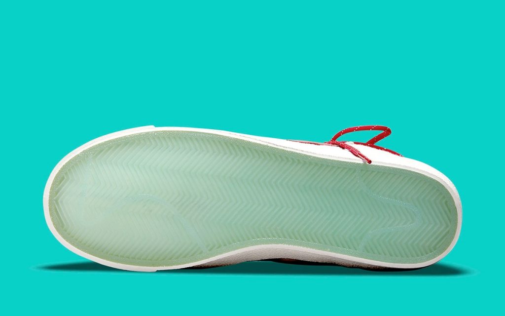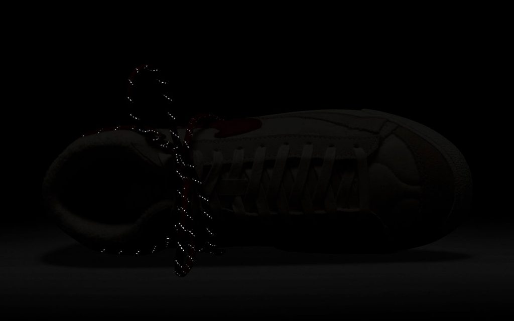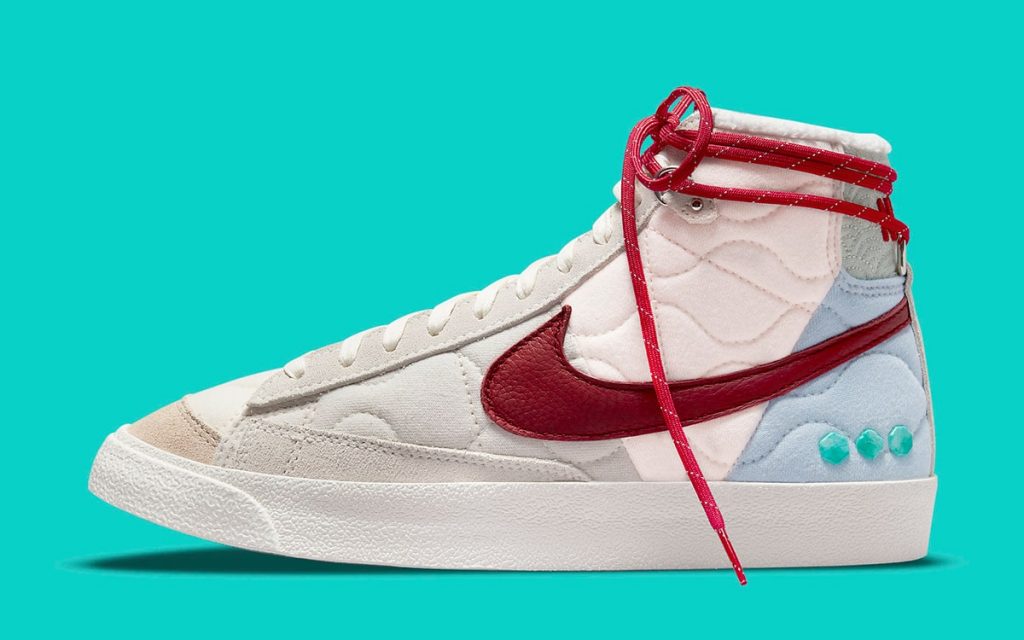 整双鞋采用经典 Blazer 鞋型为设计蓝本,不同深浅的白色以及卡其色覆盖鞋面,同时巧妙的利用车线营造出如同祥云一般的视觉效果。