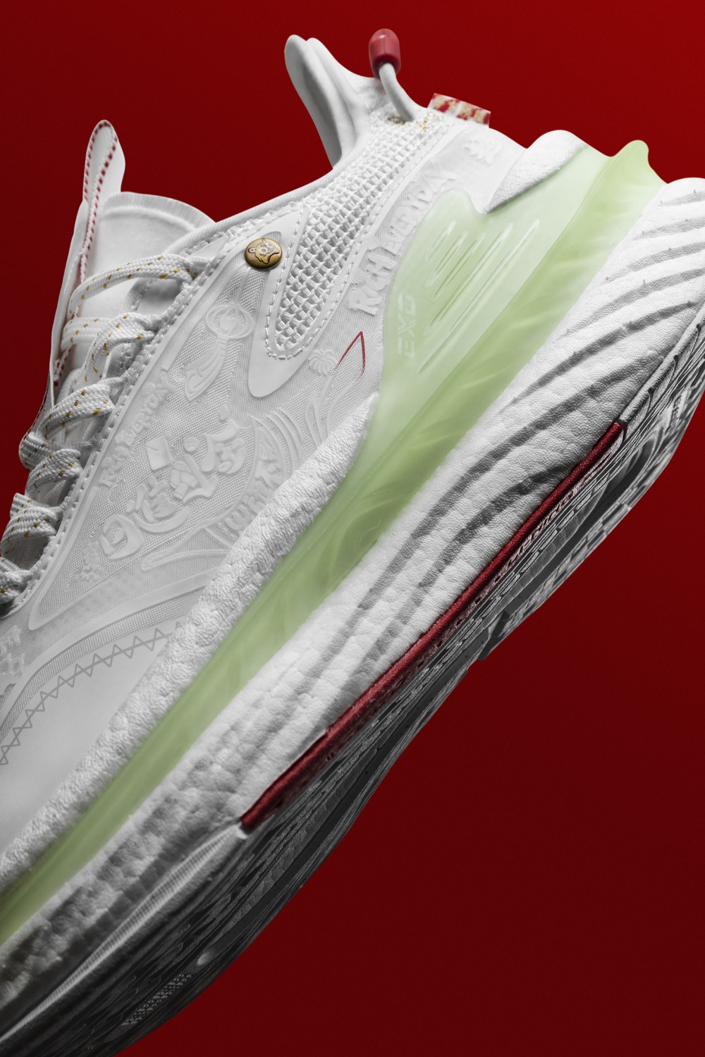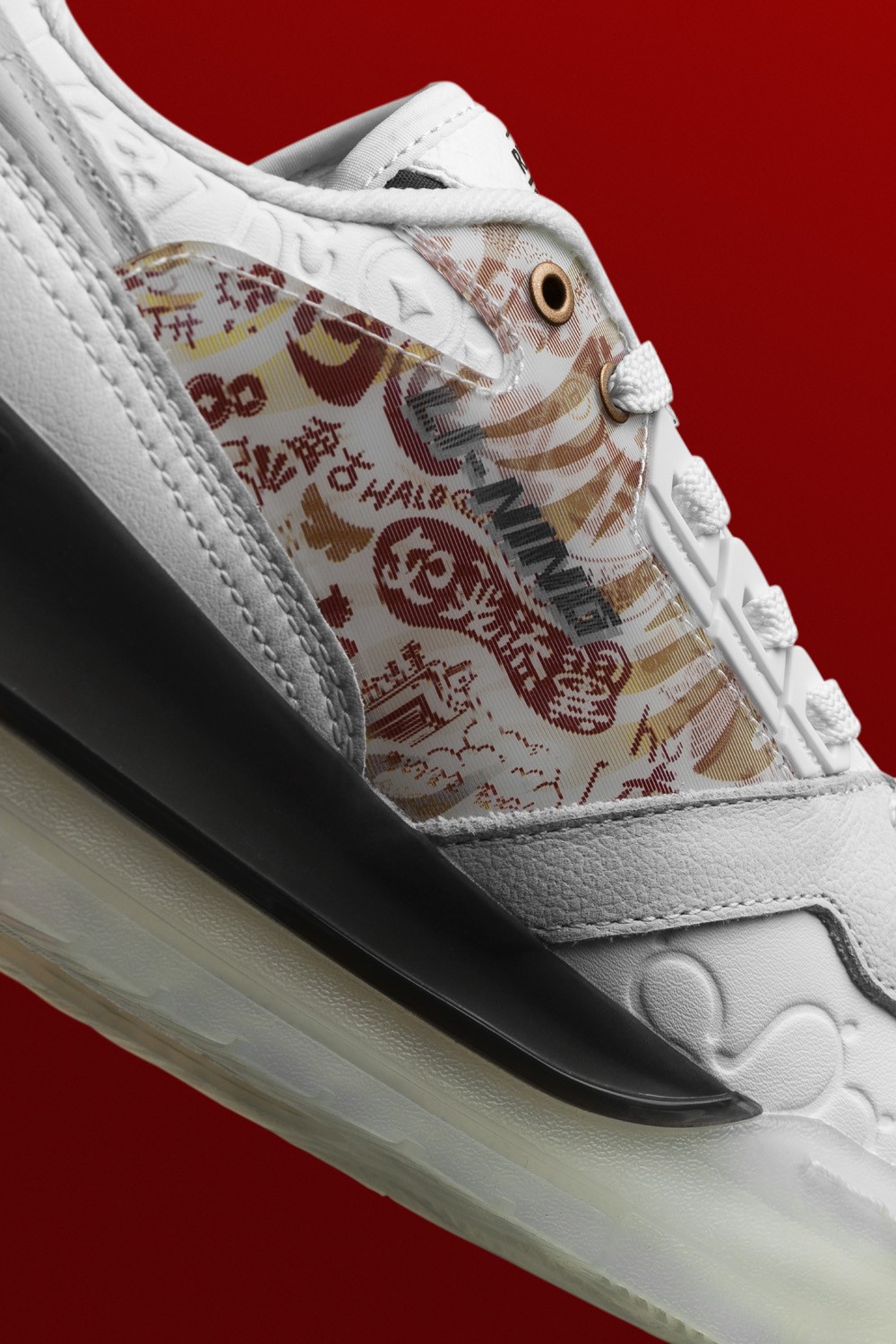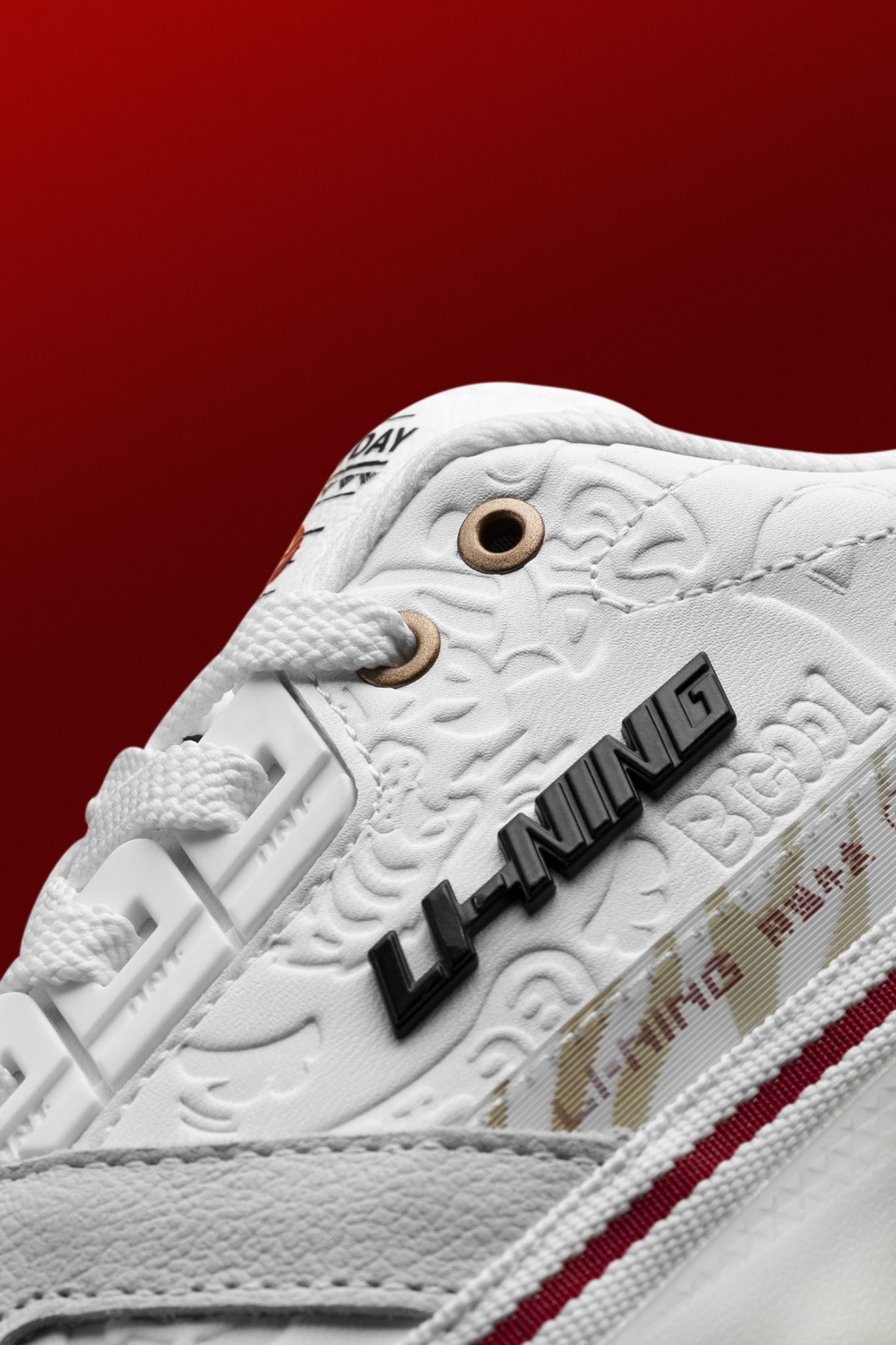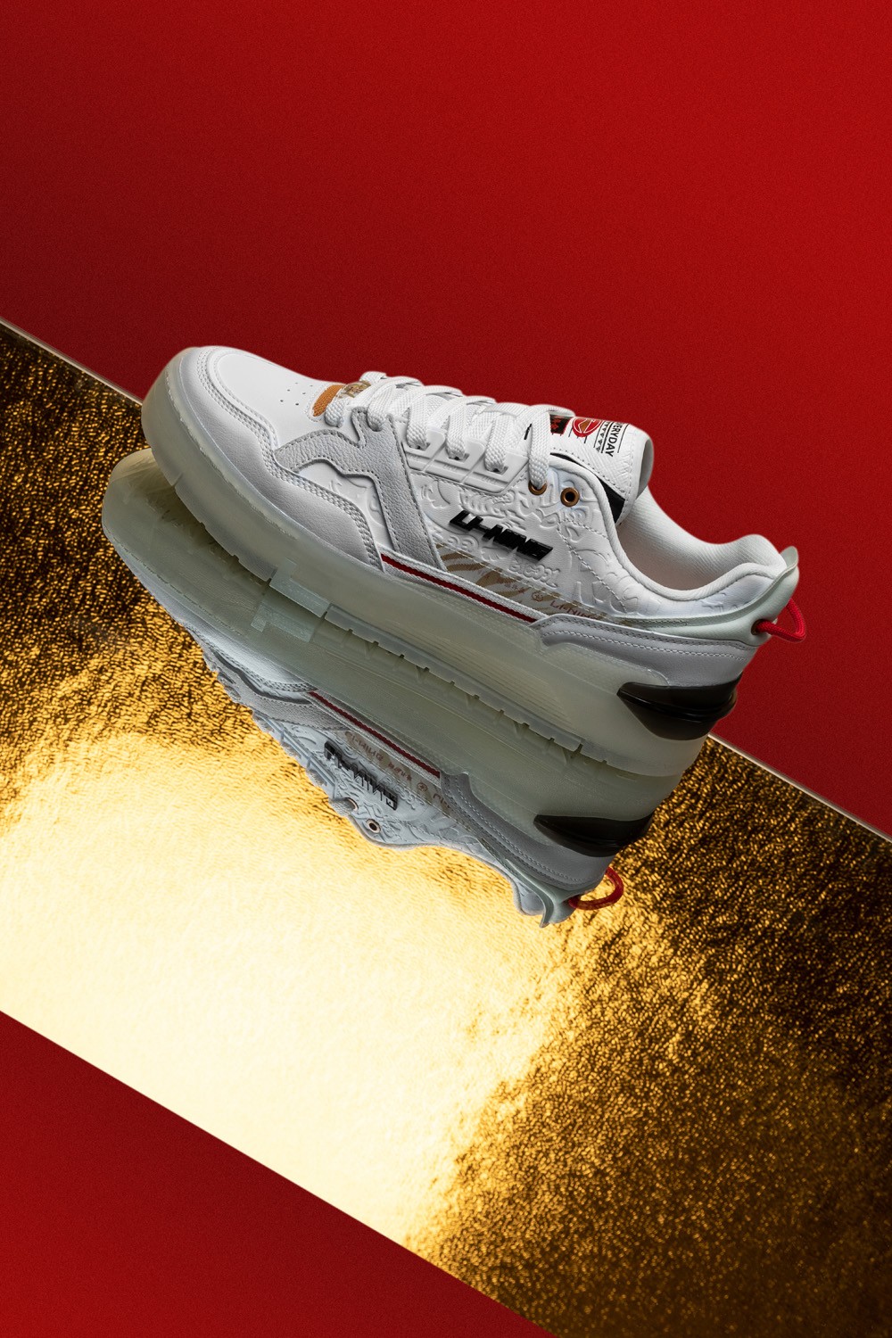 鞋身以白色为主体,细节处以红色、金色点缀。