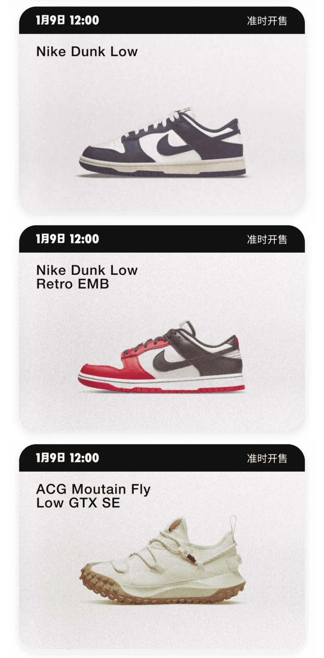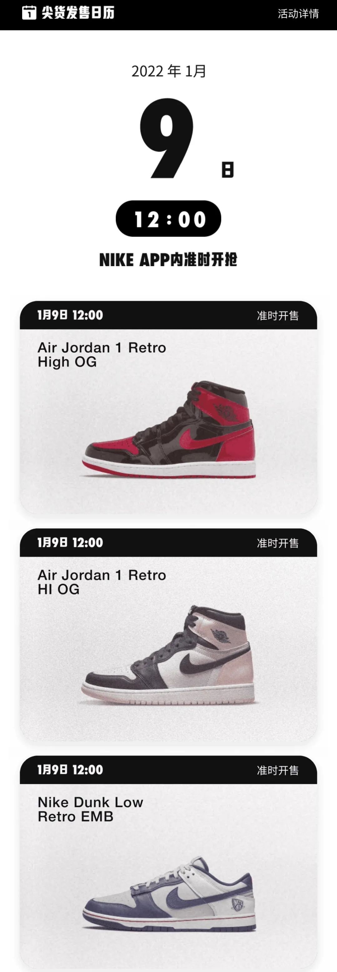 大家最关注的尖货鞋款,将在 1 月 9 日 12 点开启,本次共带来 6 款发售,包括「漆皮黑红」AJ1,泡泡糖 AJ1 以及热门的 NBA x Dunk 鞋款。