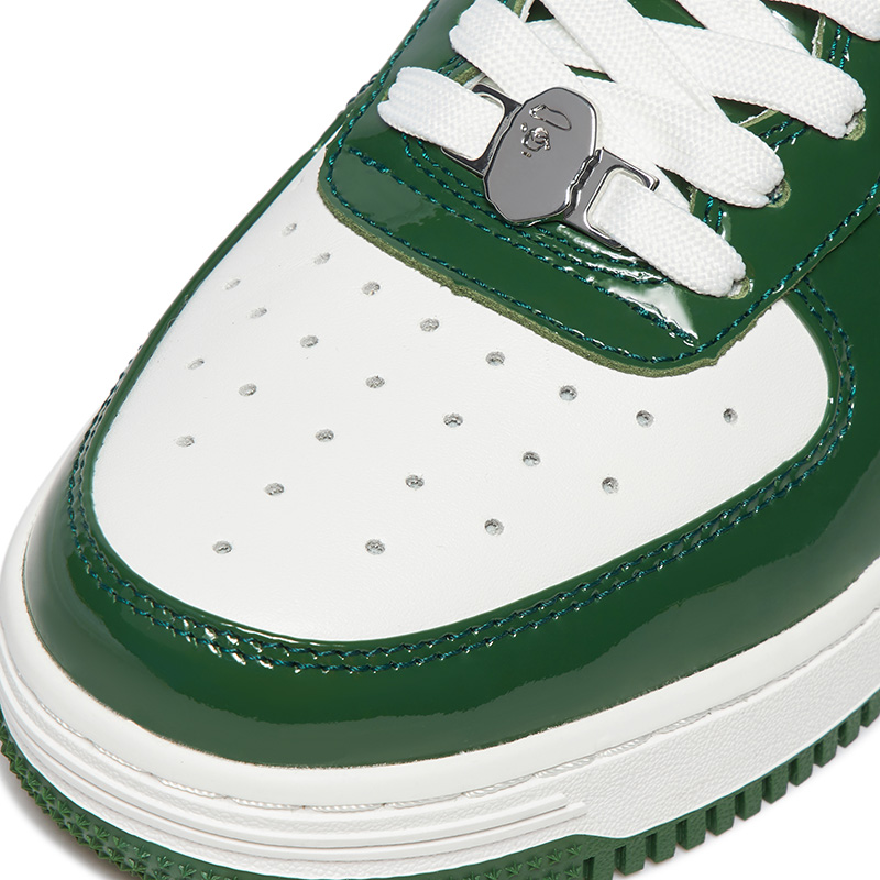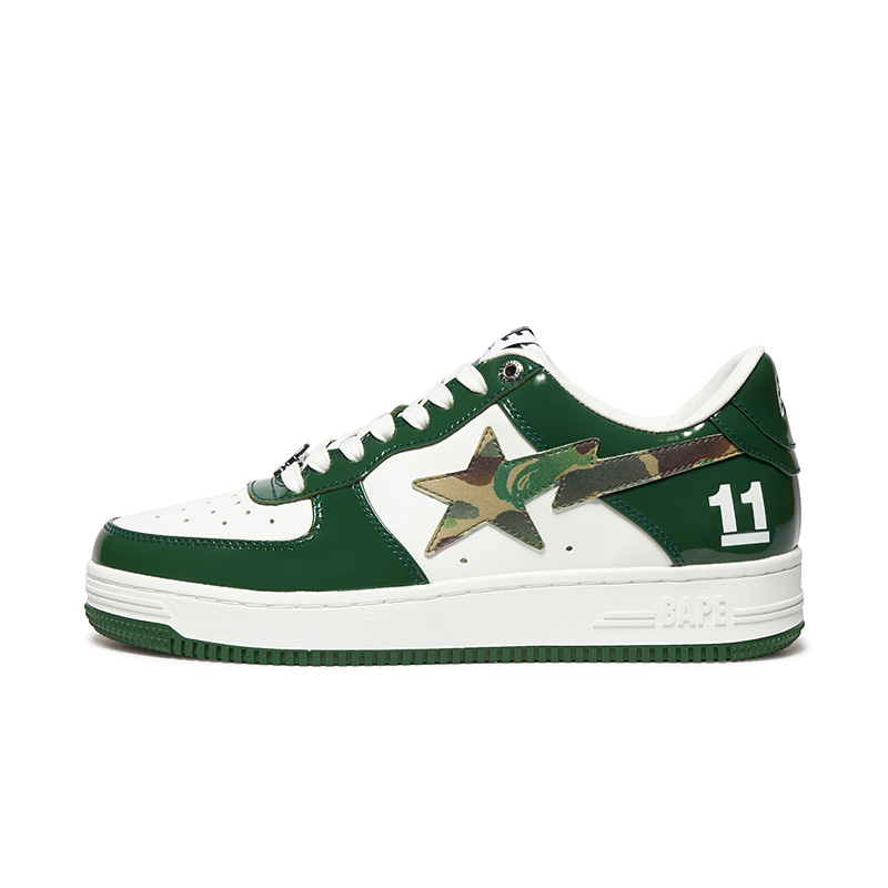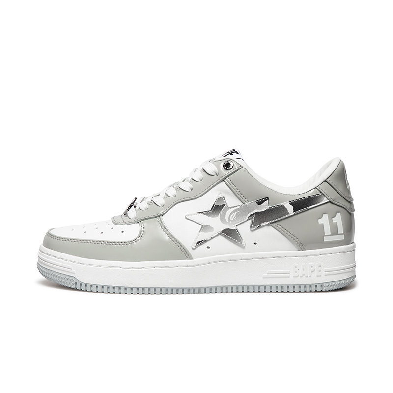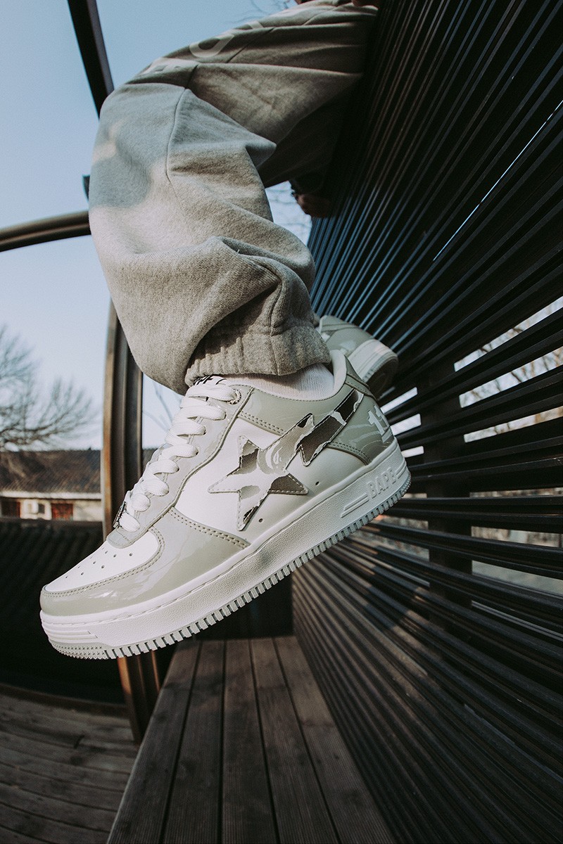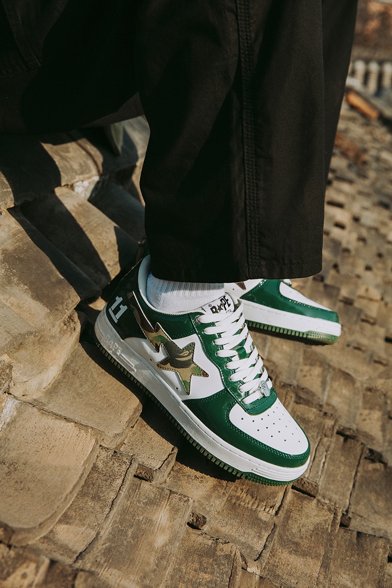 其中特别值得一提的是,在 2000 年诞生的 BAPE STA™ 首次现身在周年系列中,运用华丽的亮面漆皮与细腻皮革共同构建,带来白绿、浅灰两款经典配色。