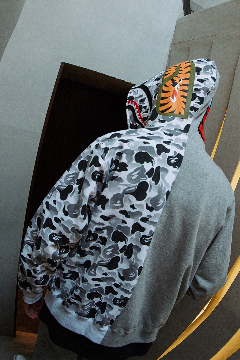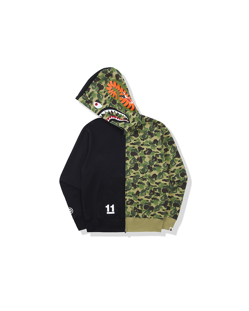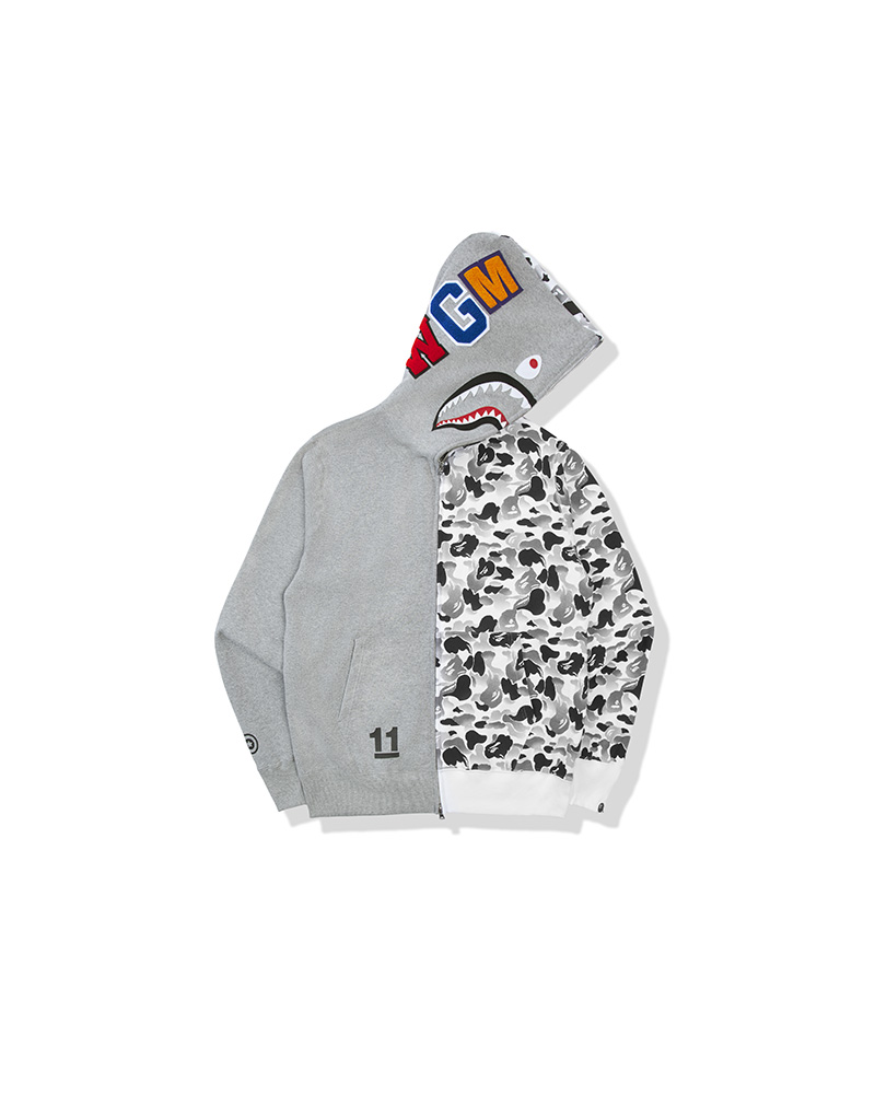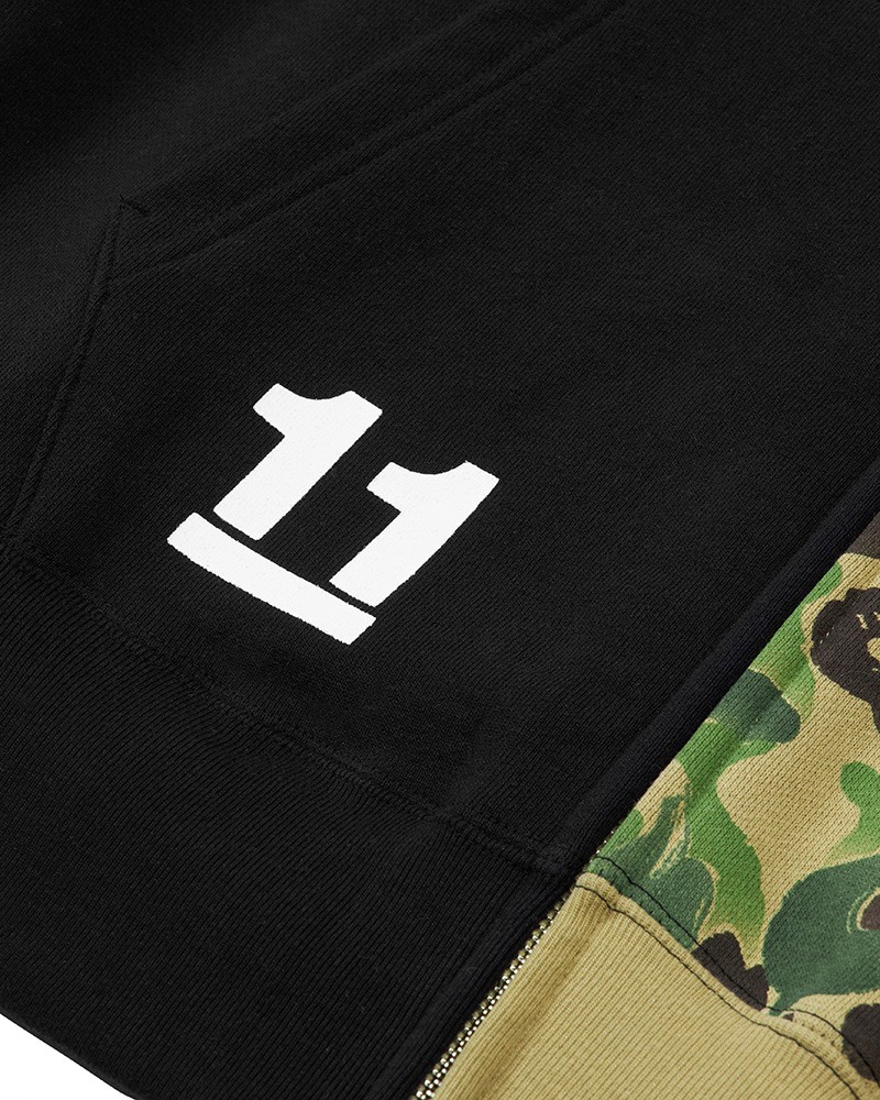 鲨鱼连帽衫则以不对称的拼接设计呈现,将满版水墨迷彩与纯色面料对半组合,保留鲨鱼元素与全拉链等经典细节,并在口袋部分醒目标注周年系列的「11」数字图案。