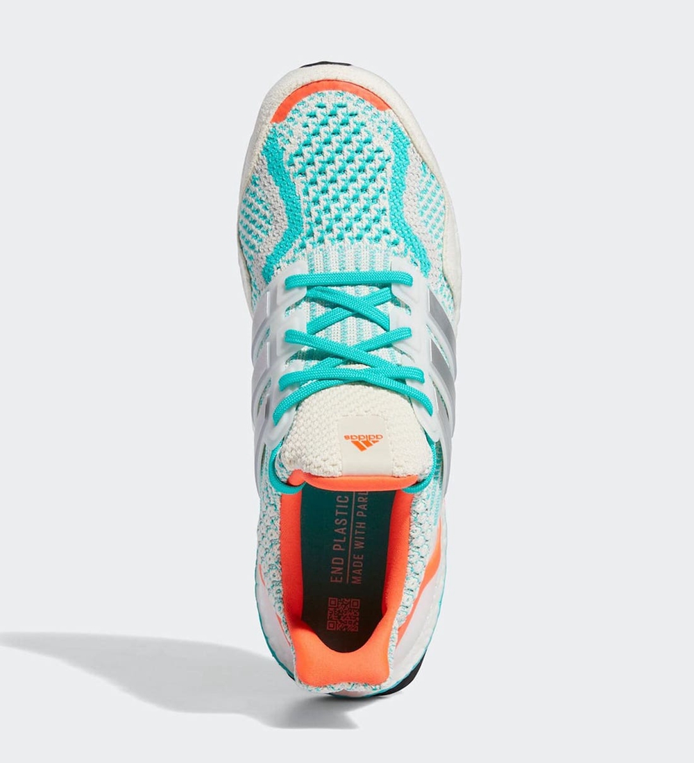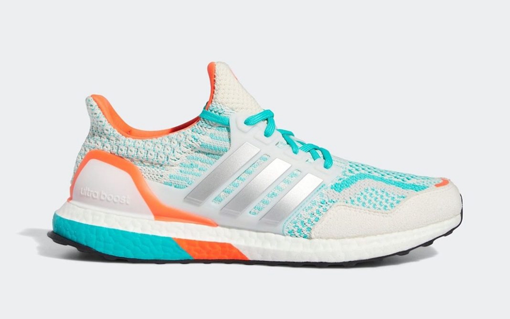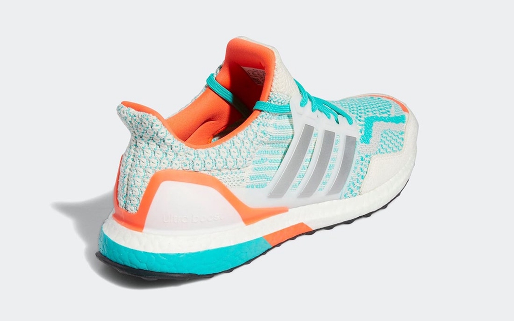 整双鞋延续着 Ultra Boost 系列的经典外观,清凉的蓝白的配色方案,搭配上橙色的点缀,鞋身两侧辅以 “三道杠” 的经典元素,适合在盛夏出街和运动。配色的设计灵感也来自于 NFL 的迈阿密海豚队。