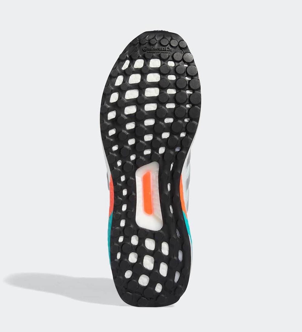 中底白色的 Boost 材料在后根处有着蓝色橙色拼接的搭配,在保证脚感的同时也增添活力的气息。