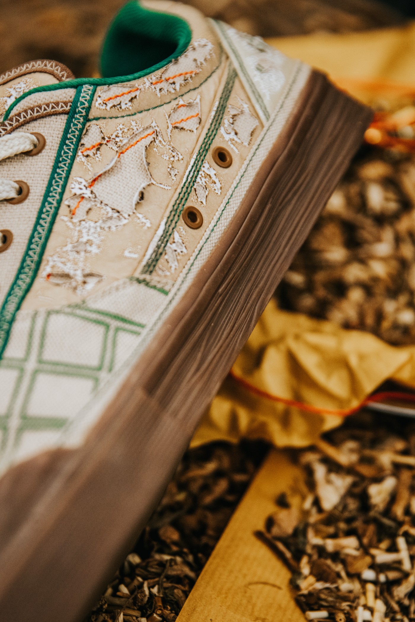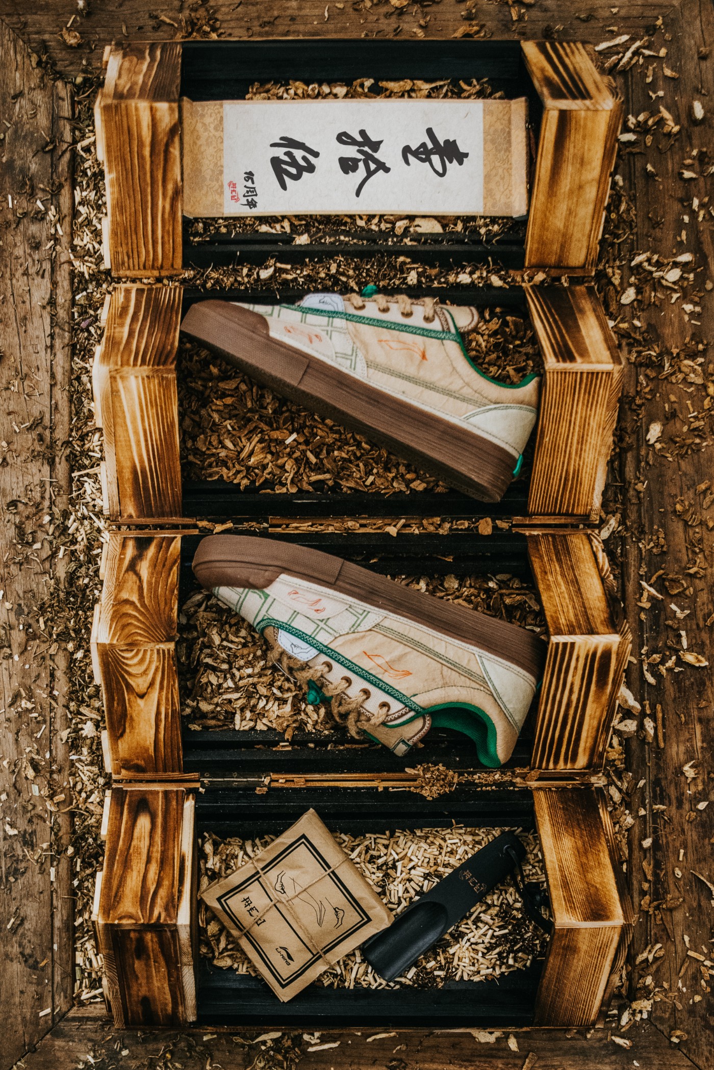 此次联名鞋款以中医所用的中药材作为主要设计灵感,将古代包装中草药的桑皮纸融入鞋面材质中,并带来特殊可撕扯的双层鞋面,通过球鞋的磨损变化,让每一双都可以独一无二。