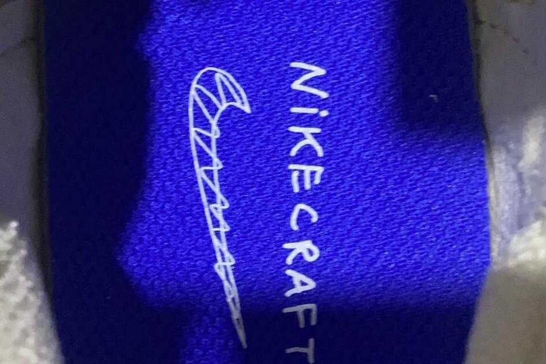 鞋垫和鞋舌内侧的标签印有 Tom Sachs 的联名标识,鞋款后跟带有 Nike 品牌标志压印,彰显联名身份。