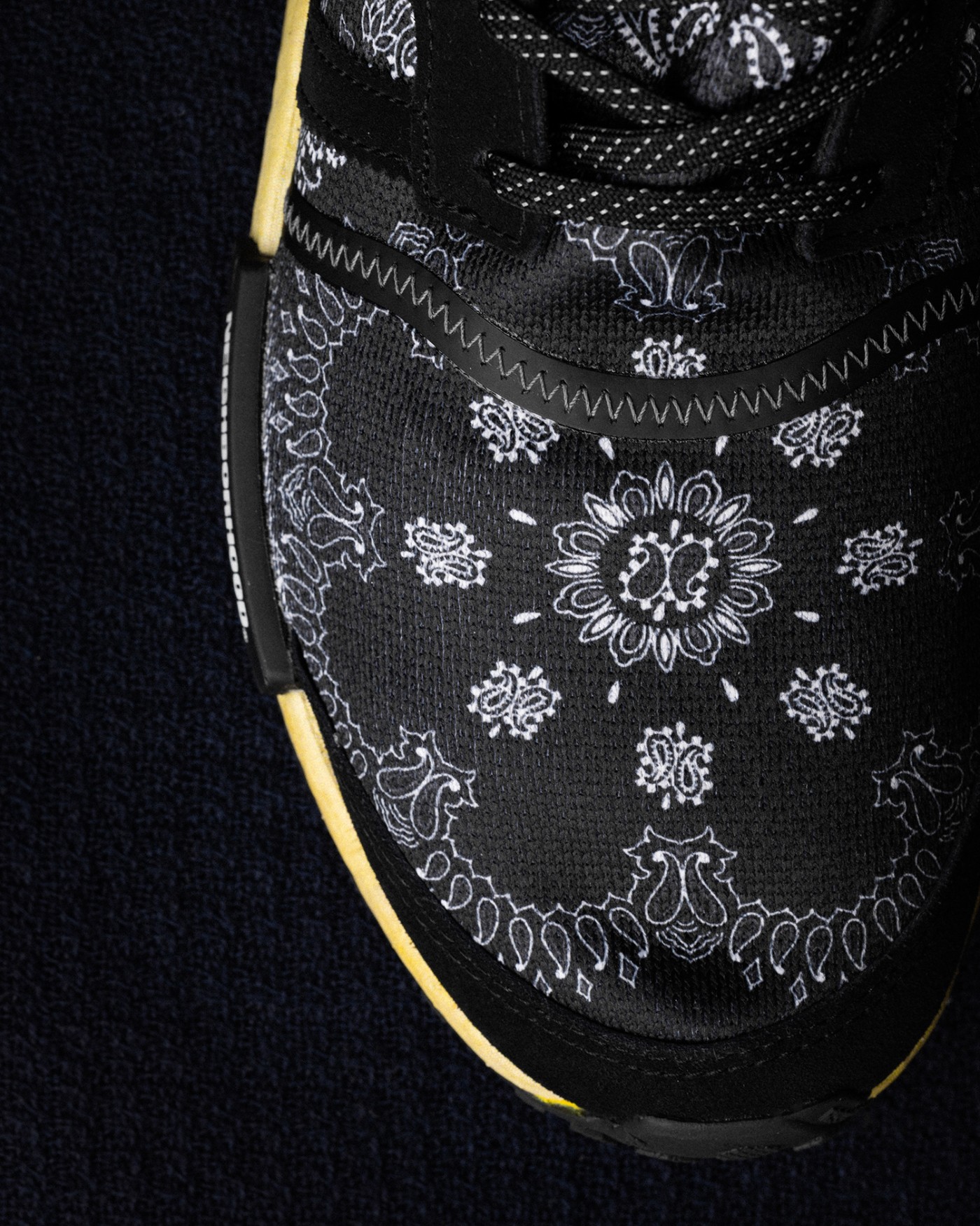另外一款配色则是采用相当深色的海军蓝覆盖整个鞋身,同样在鞋面、侧身以及后跟等部位覆盖腰果花图案。