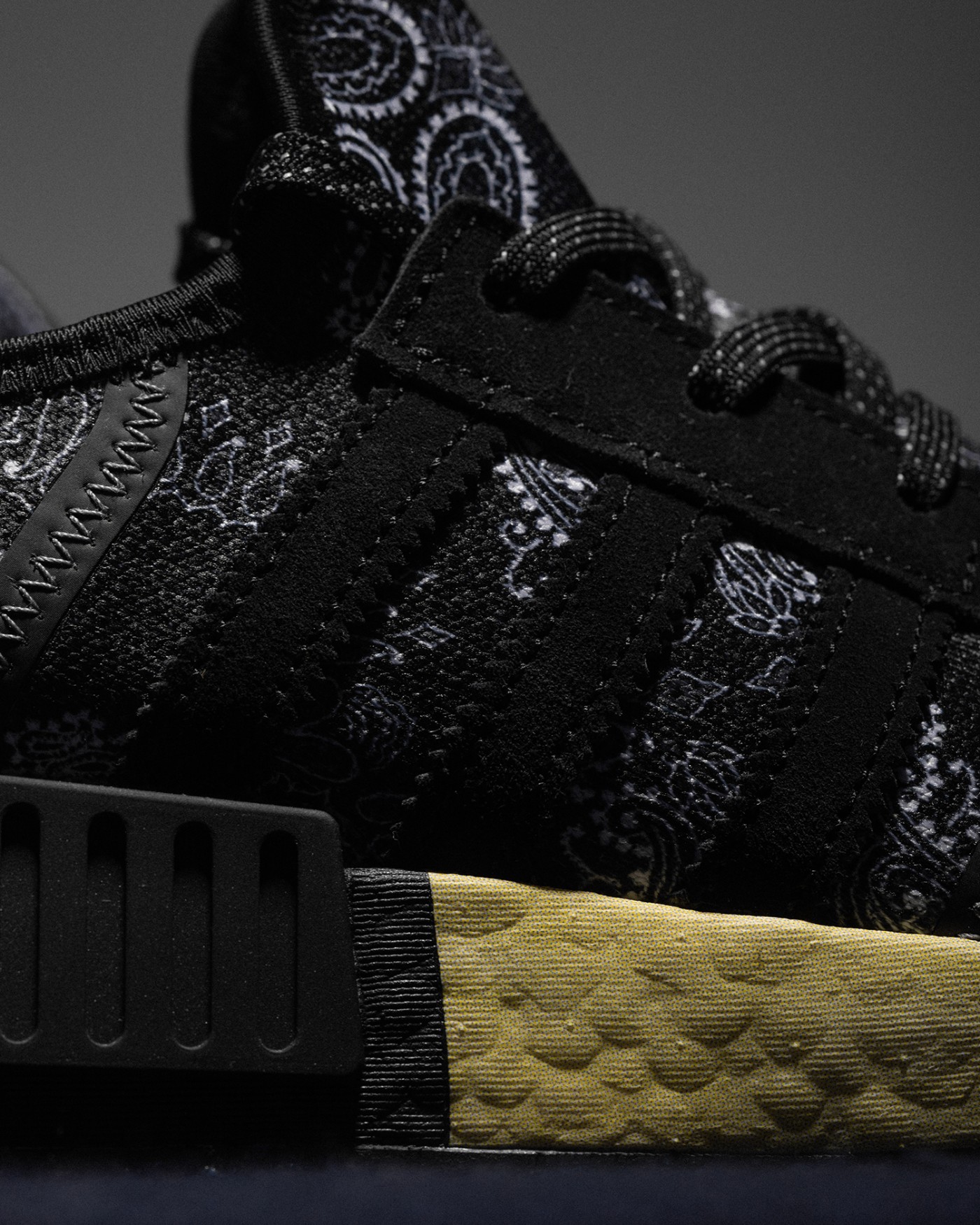 NMD R1 搭载全掌 Boost 缓震科技,但是在颜色上格外走心,中底前半部分经过明显的氧化做旧处理,呈现出不同深浅的黄色。