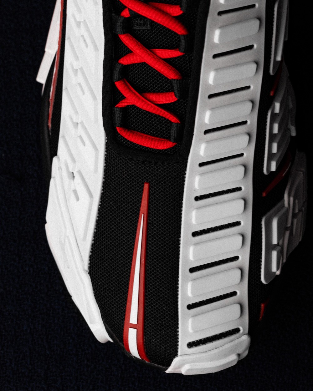 整体采用低帮跑鞋廓形,以黑白两色间隔呈现,红色点缀穿插其中。