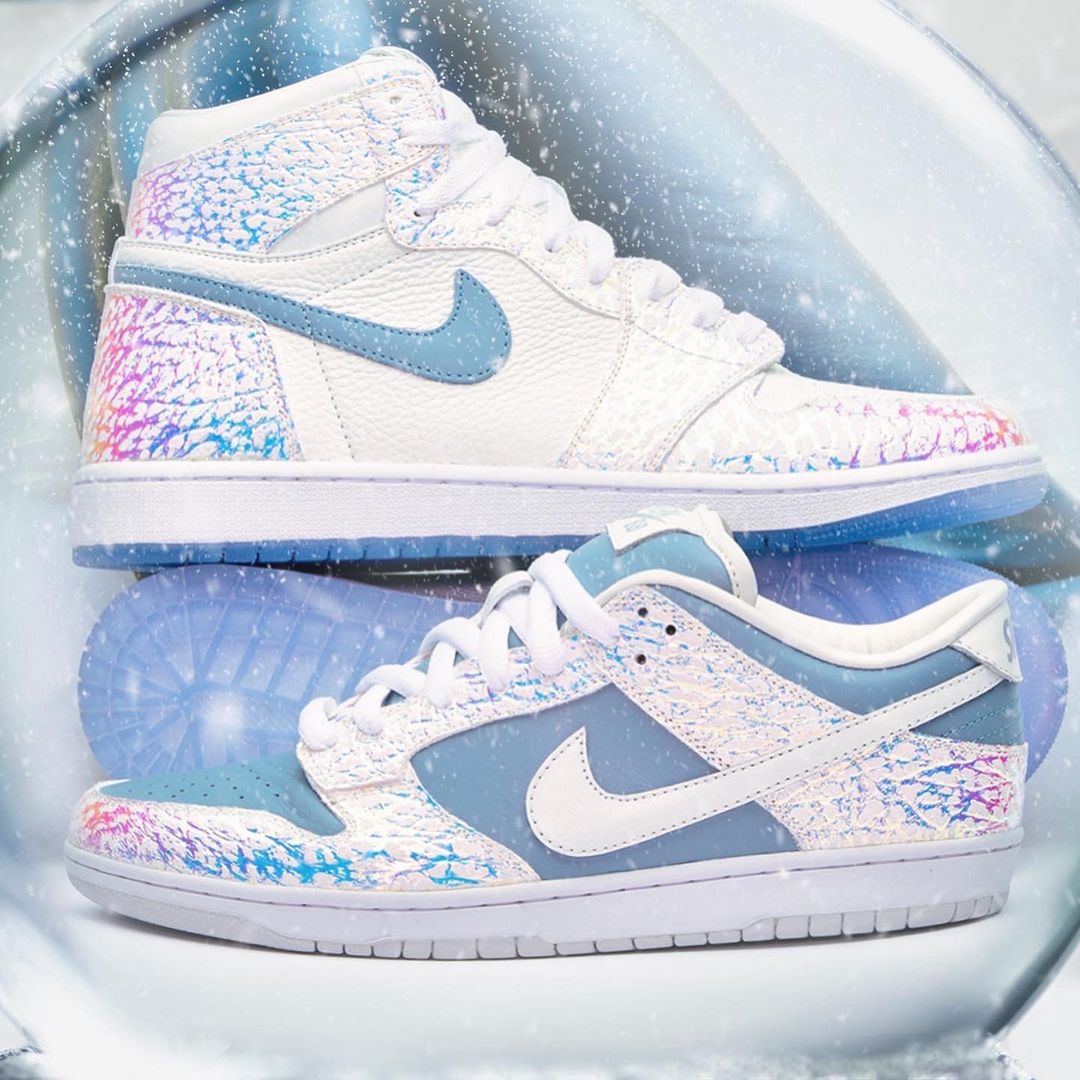 新作包含 Air Jordan 1、Dunk Low 和 Dunk High 三款鞋型,整体以白色和雾霾蓝色为主调。