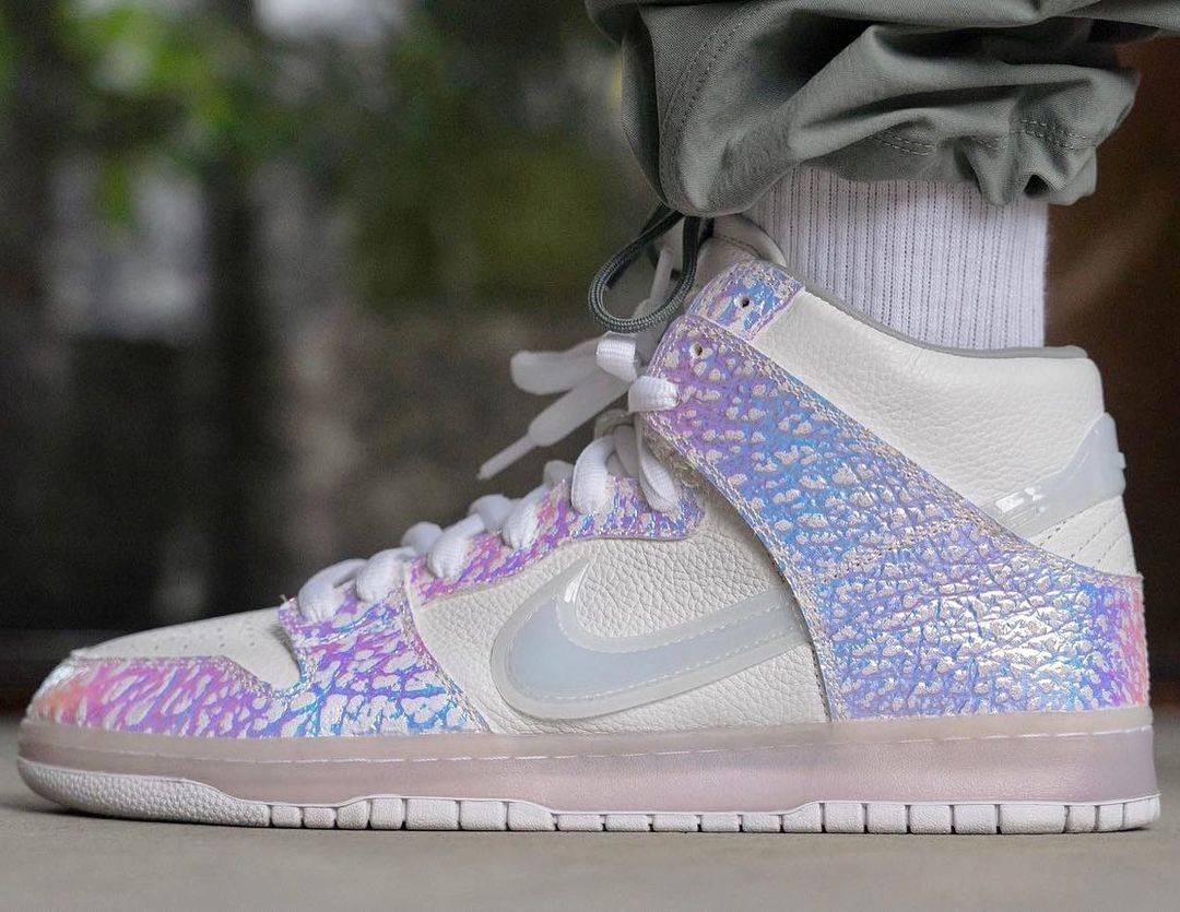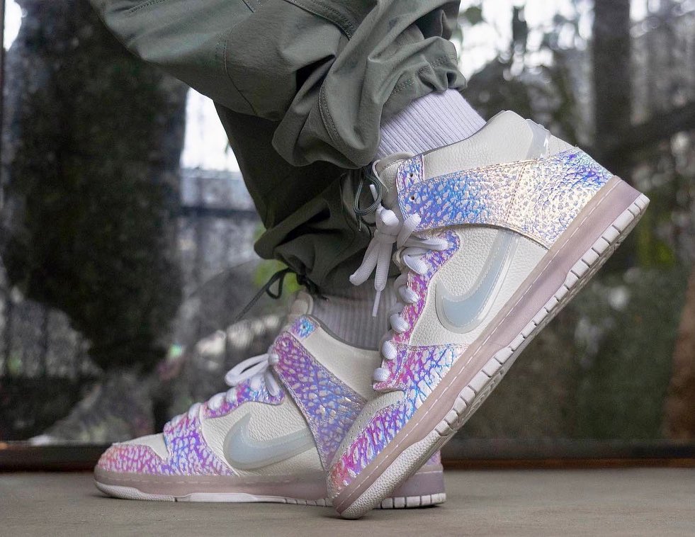 通过炫彩镭射效果的鞋面材质呈现经典的大象纹理,BlingBling 的感觉让小编不禁想到曾经那双超级碗 Air Trainer 1。