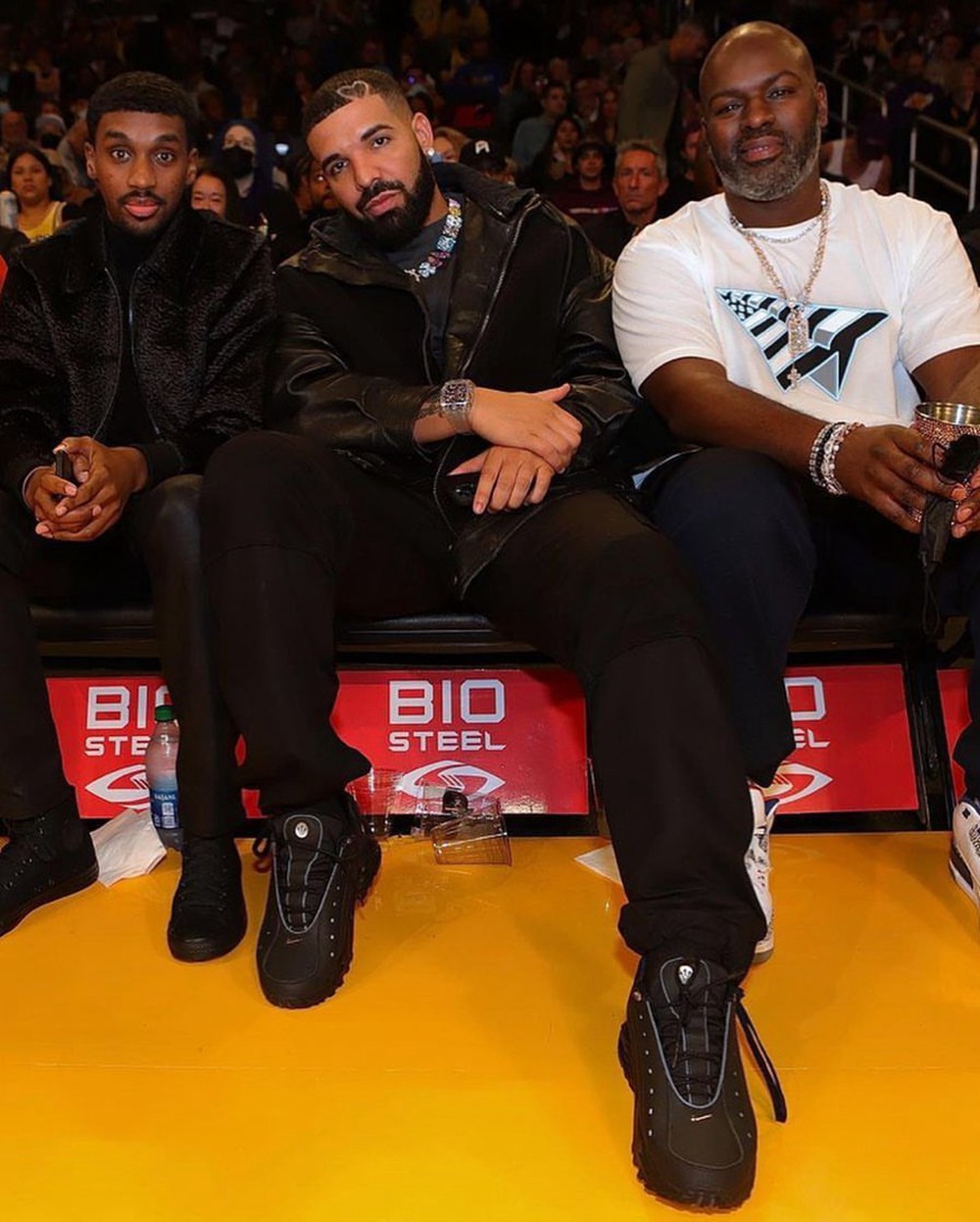 Drake 本人也在最近观战 NBA 比赛时,上脚了这双鞋款,不得不说纯黑色真的 YYDS!