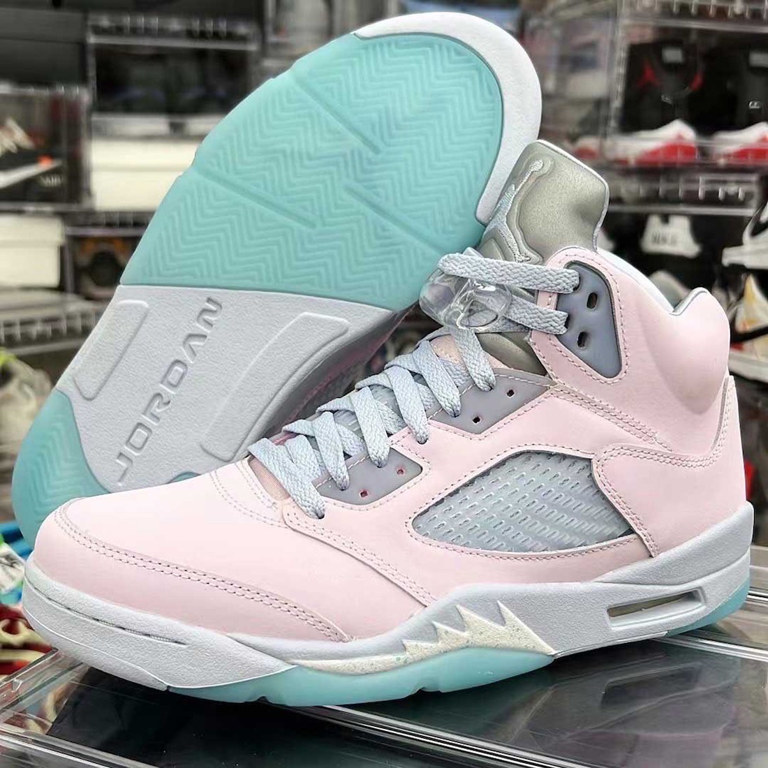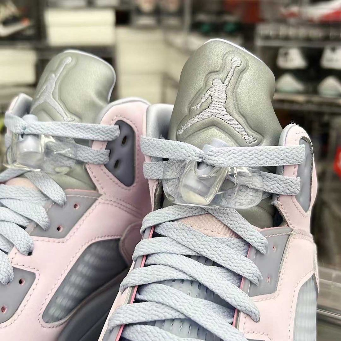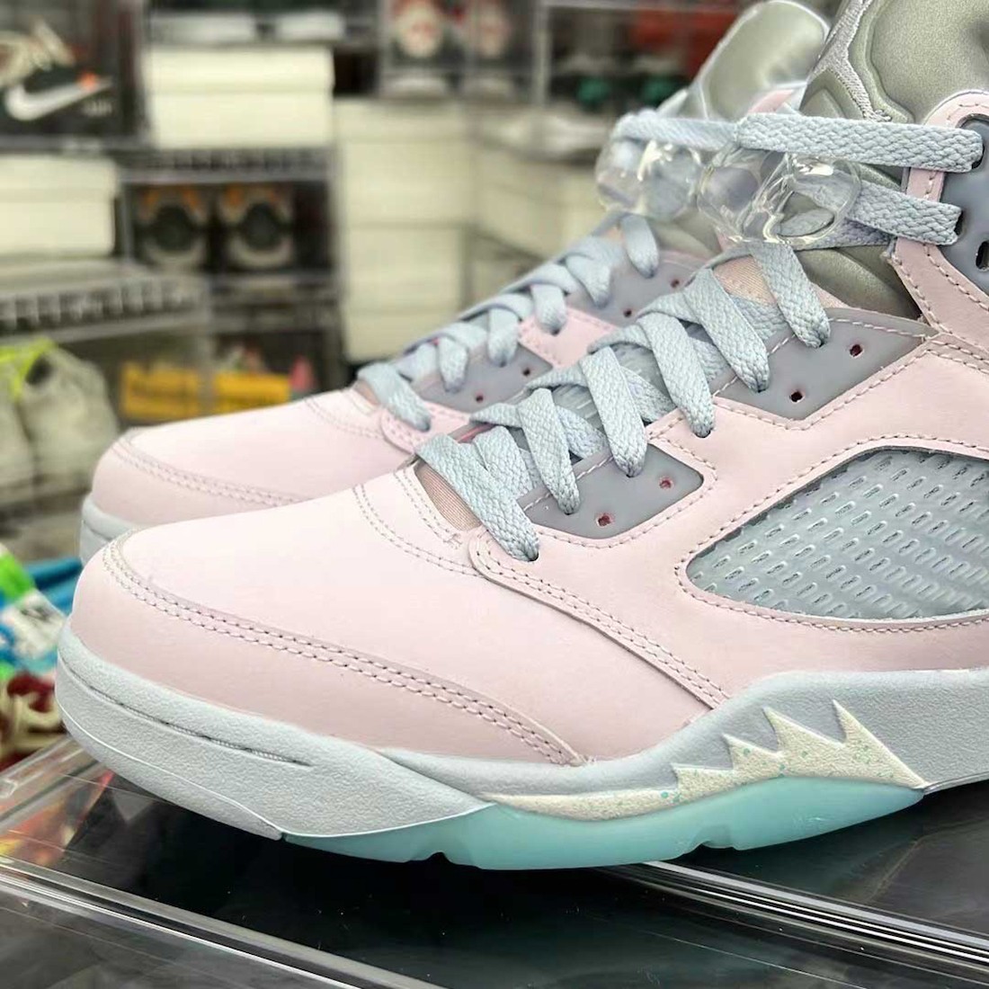 整双鞋都以马卡龙色系搭配,鞋面以淡粉色牛巴革,鞋带、中底和内衬等细节搭配淡蓝色,再加上 Air Jordan 5 经典的 3M 反光鞋舌,将复活节彩蛋的甜美气息完整呈现。