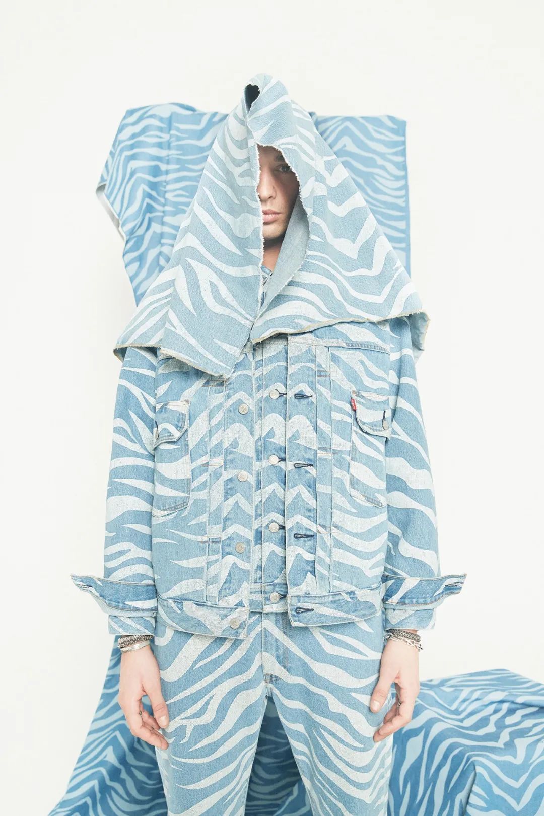 联名系列中包含夹克、长裤和长裙共四件单品,整体色调采用浅色水洗牛仔蓝,通过特殊手法呈现出满印虎纹的视觉效果,辨识度极高。