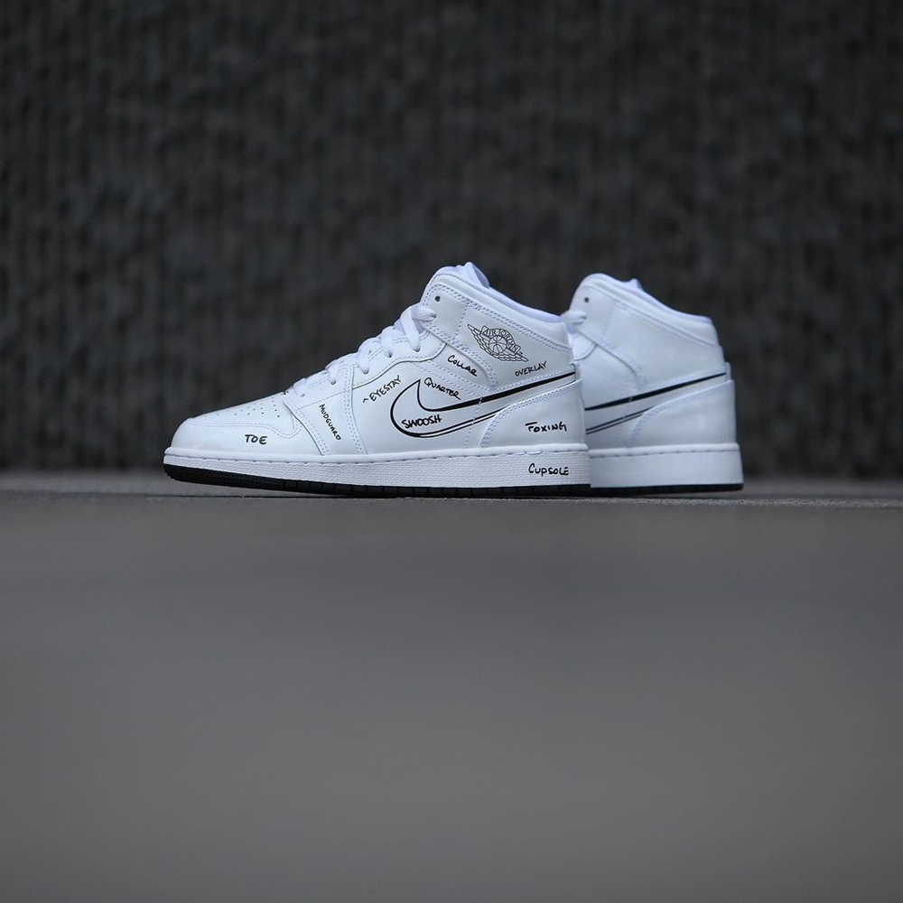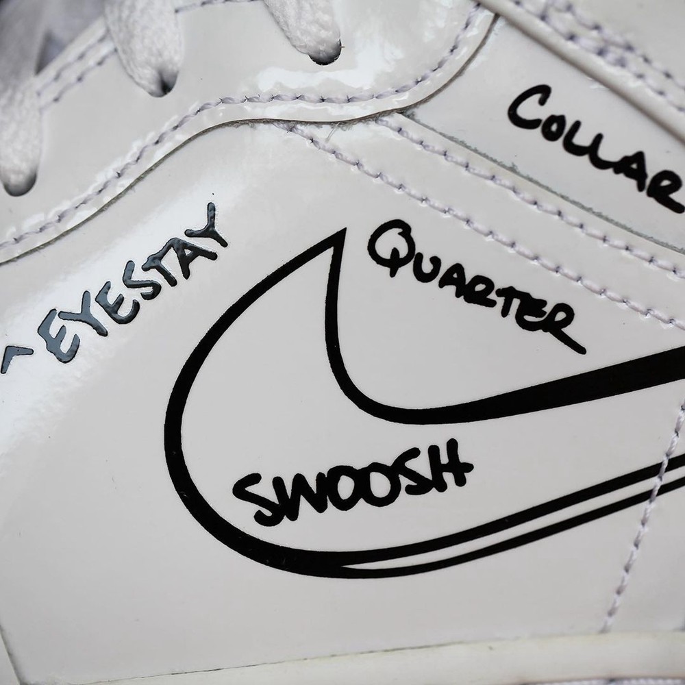 鞋身两侧的 Nike Swoosh 也采用这种涂鸦的风格呈现,像是用油漆笔书写在纯白色的纸张上面一样。
