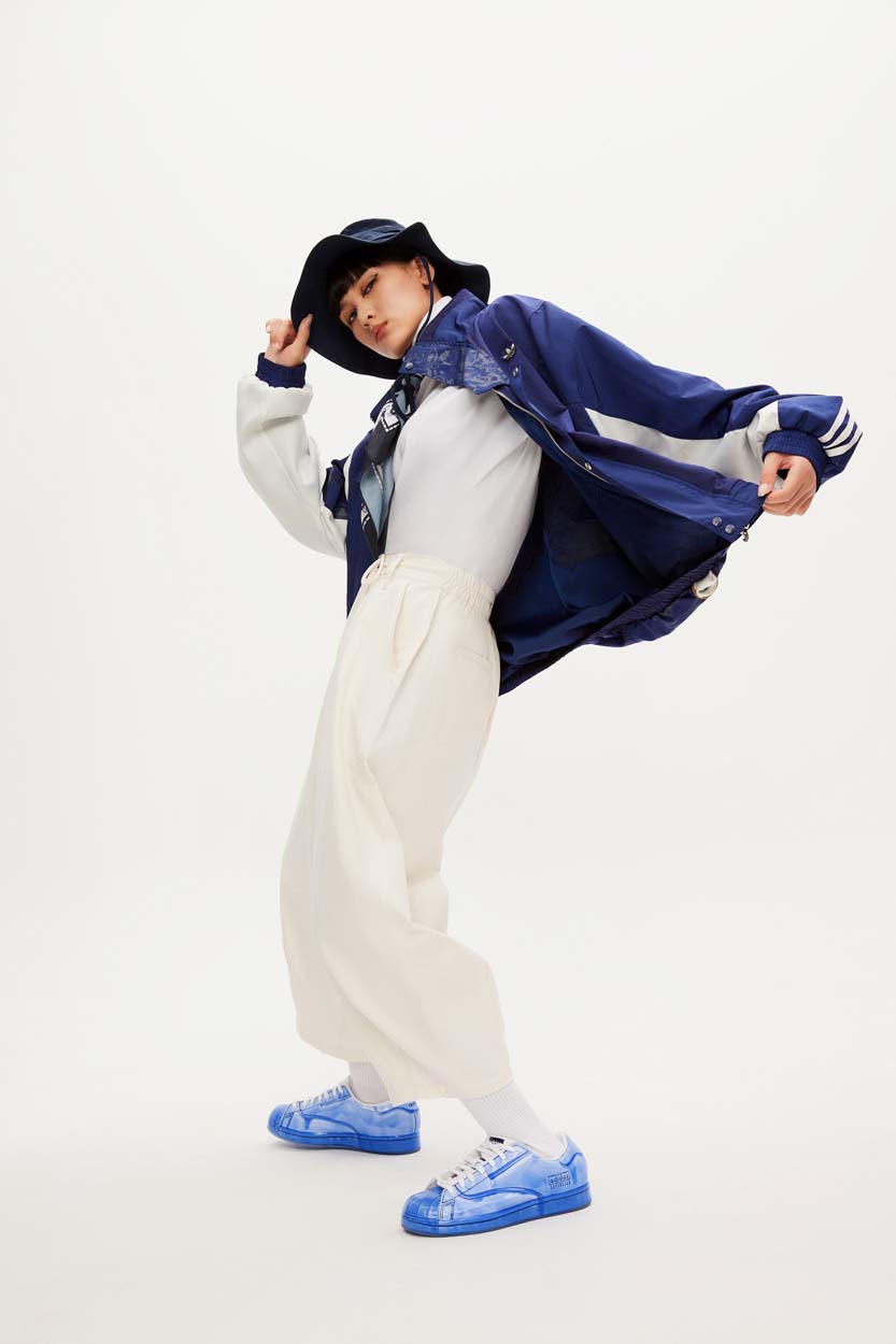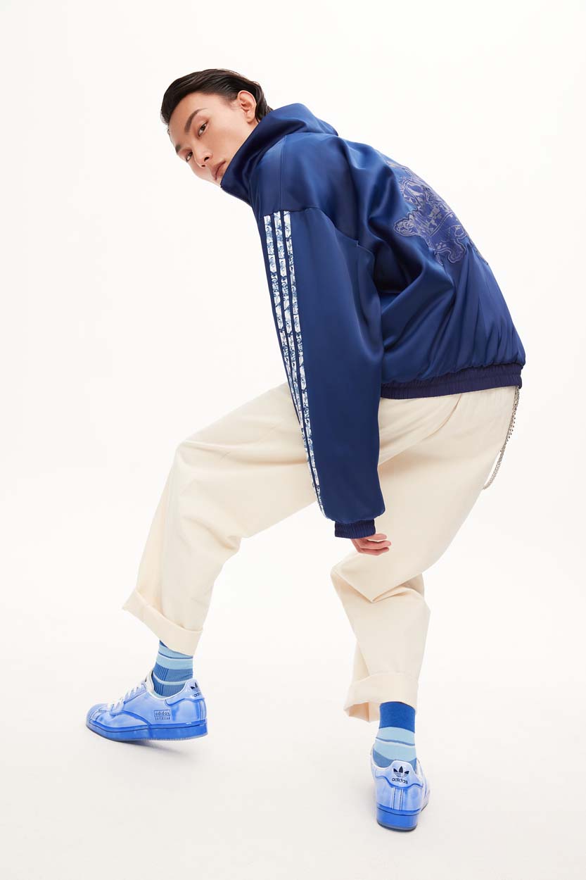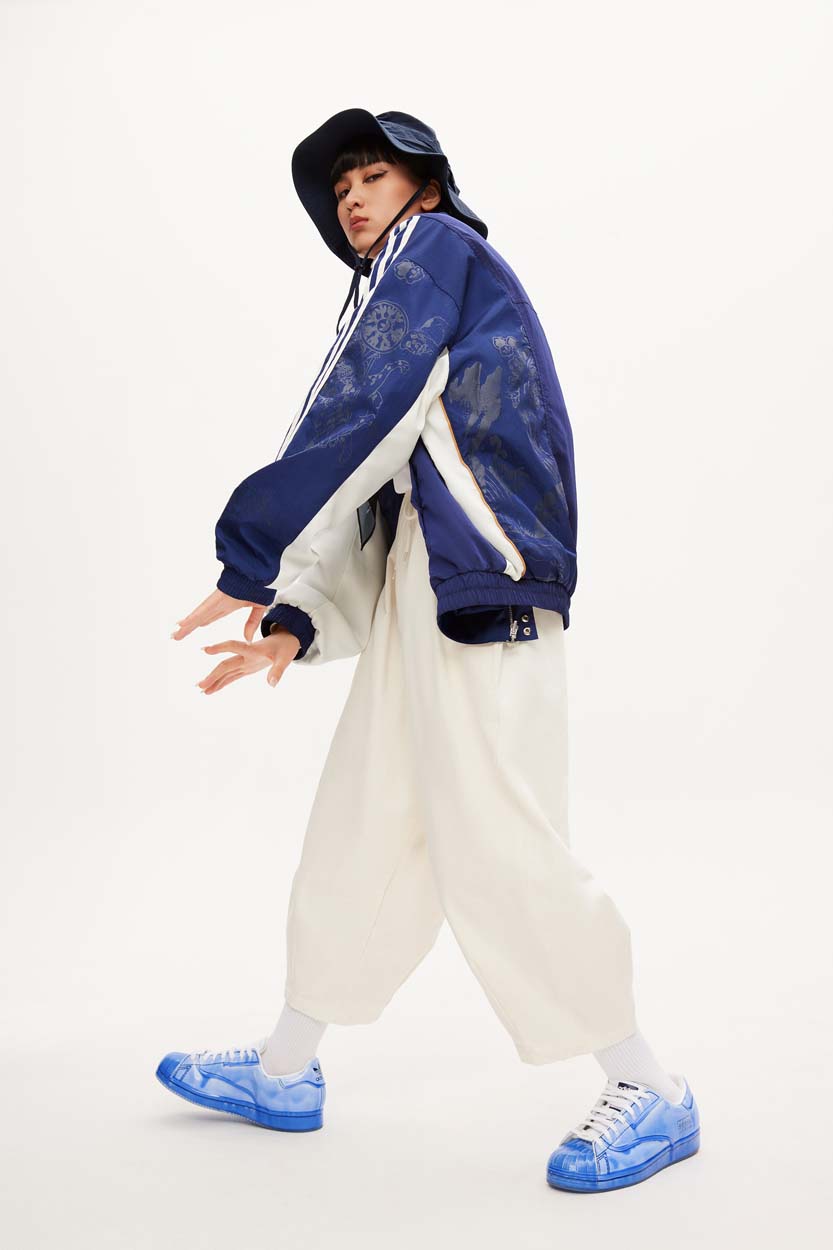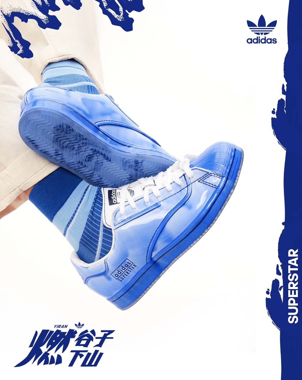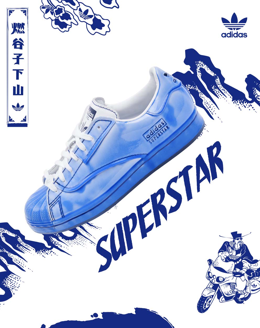 其中 Superstar 鞋款以制作陶瓷艺术品时常用的水洗蓝釉色贯穿球鞋整体,鞋面蓝釉部分由人工涂刷处理,呈现出晶莹剔透的陶瓷质感,「燃谷⼦下⼭」的画⾯也被融⼊了鞋垫的设计中。