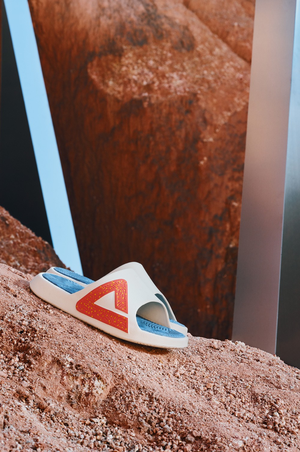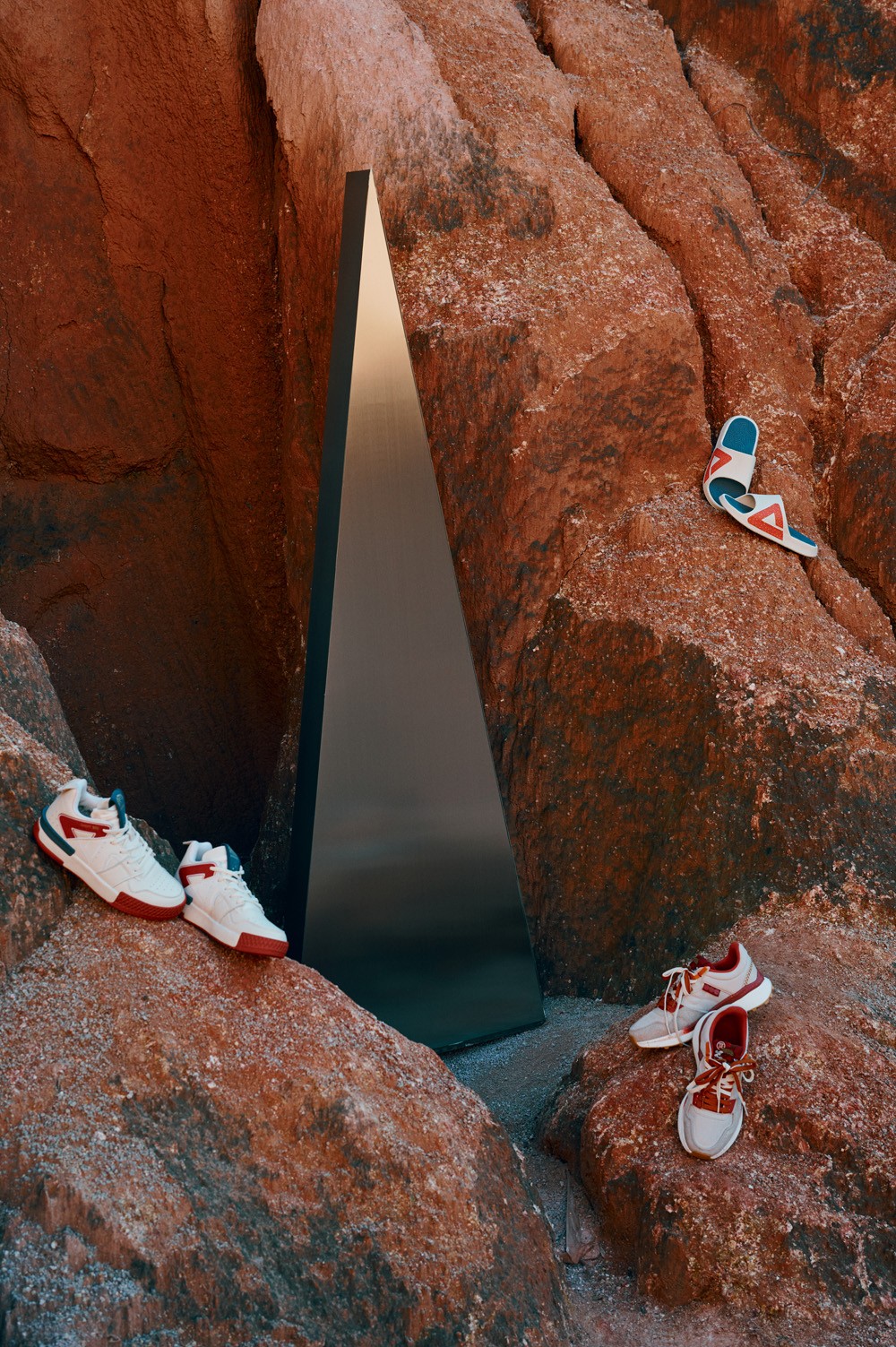 鞋身采用皮革 + 织物,隐藏式大三角设计带来亮眼细节和丰富层次感。